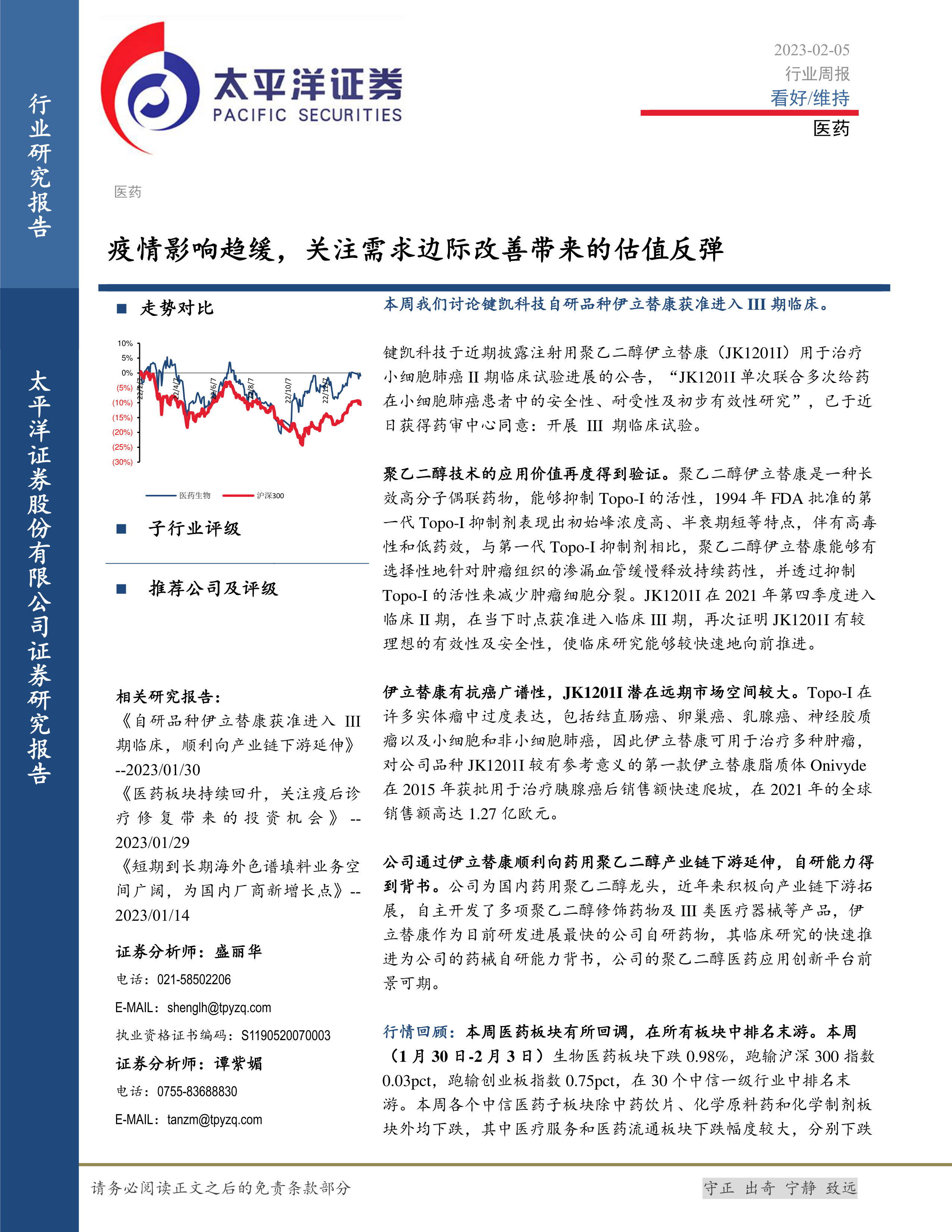 本报告的核心观点是:医药板块在经历疫情影响后,估值处于底部区间,随着疫情影响趋缓和政策预期向好,存在边际改善和估值反弹的潜力。报告重点关注键凯科技自研品种伊立替康获准进入III期临床试验这一事件,并以此为切入点,分析医药行业整体市场走势、投资机会以及潜在风险。