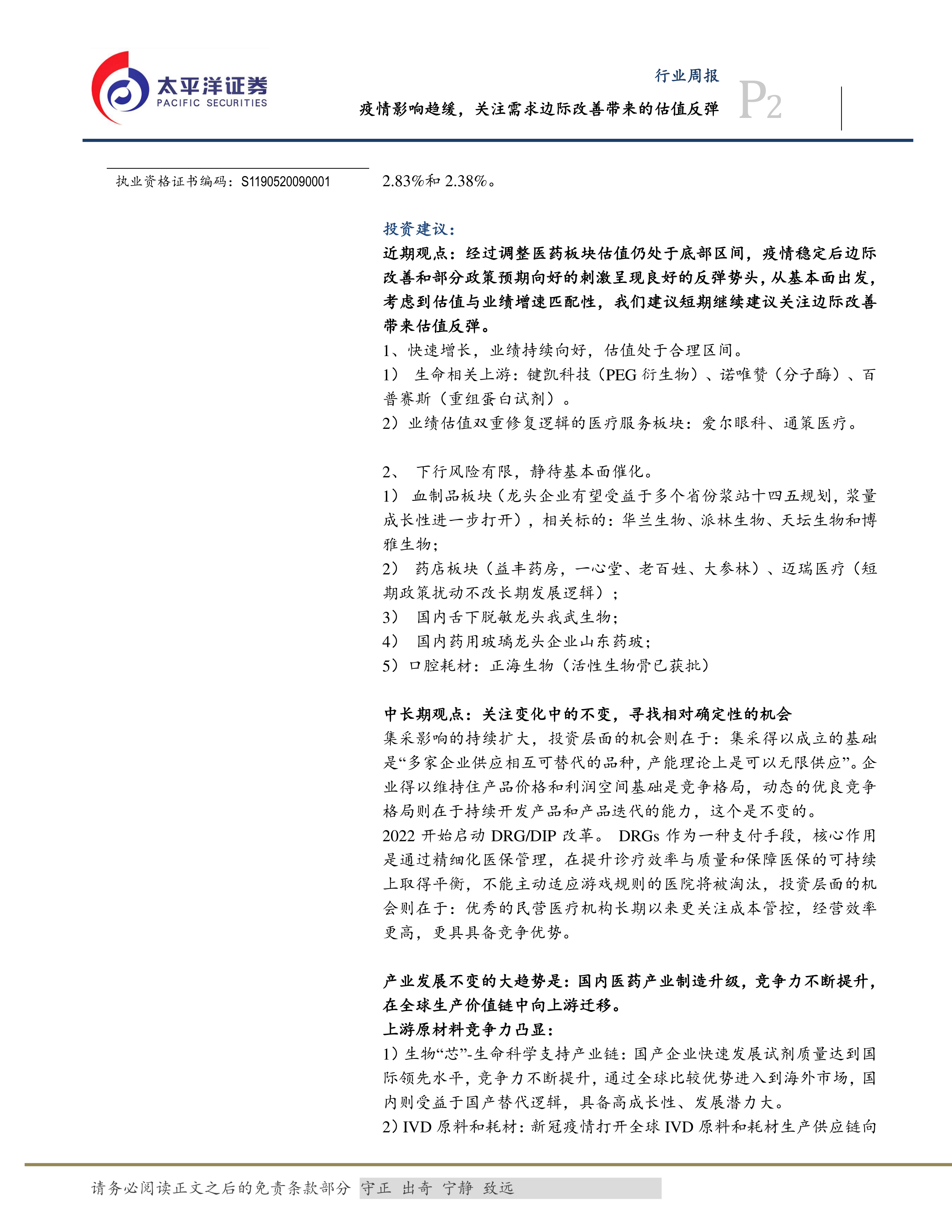 近期观点认为,经过调整后,医药板块估值处于底部区间,疫情稳定后边际改善和政策预期向好将带来反弹。报告建议关注快速增长、业绩持续向好且估值处于合理区间的标的,例如生命相关上游企业(键凯科技、诺唯赞、百普赛斯)和业绩估值双重修复逻辑的医疗服务板块(爱尔眼科、通策医疗)。同时,报告也指出下行风险有限,建议静待基本面催化。