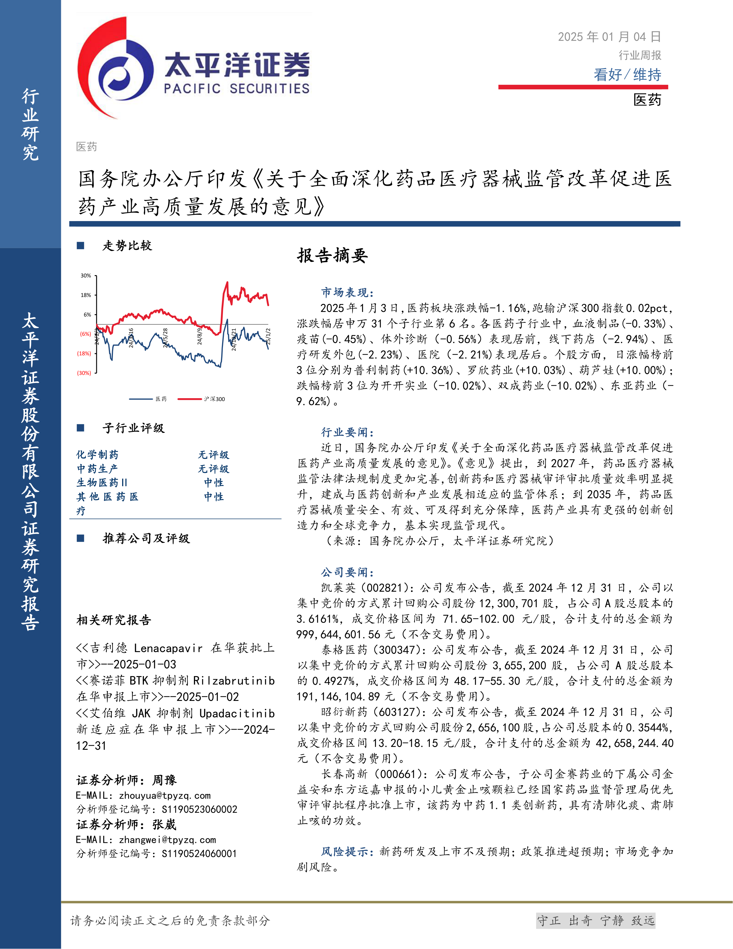 本报告的核心观点是:2025年1月3日,医药板块整体表现略逊于大盘,但个股表现分化明显,部分个股涨幅显著。国务院办公厅印发的《关于全面深化药品医疗器械监管改革促进医药产业高质量发展的意见》为医药行业长期发展提供了政策利好,但短期内市场波动仍需关注。