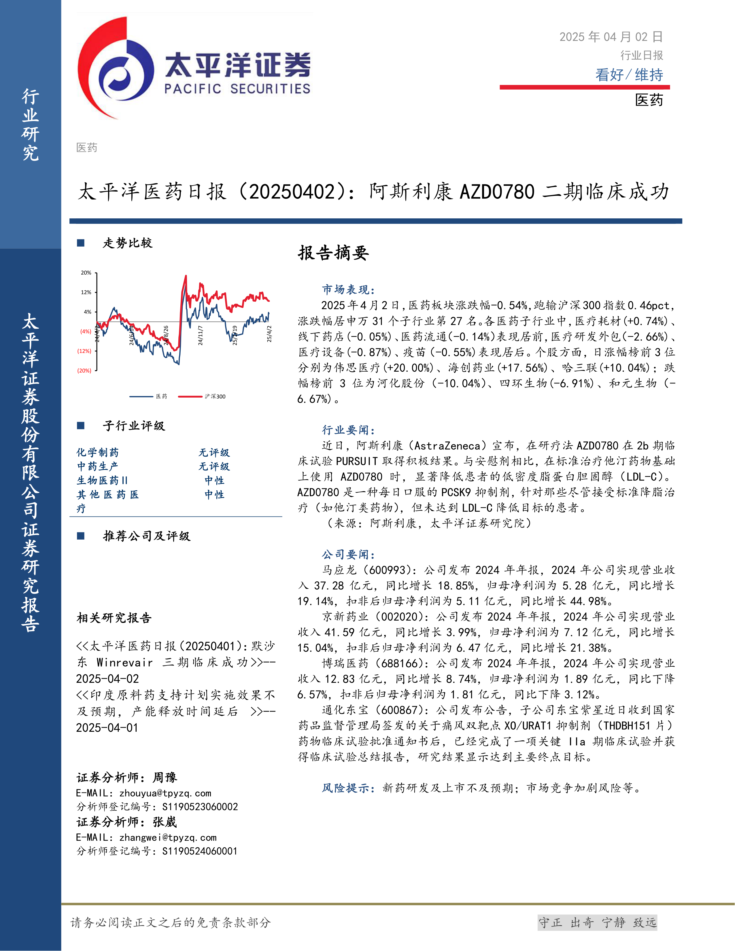 本报告分析了2025年4月2日医药板块的市场表现,重点关注了阿斯利康AZD0780二期临床试验成功、部分医药公司2024年年报业绩以及通化东宝痛风双靶点药物临床试验进展等重要事件。 报告显示,医药板块整体表现疲软,但个股表现分化明显,部分公司业绩增长强劲,部分公司业绩出现下滑。 阿斯利康AZD0780的成功为行业带来利好,但整体行业未来走势仍存在不确定性,投资者需谨慎决策。 报告最后提供了行业评级和公司评级标准,但未对具体公司给出明确的投资建议。 投资者需结合自身风险承受能力和投资目标,进行独立的投资判断。