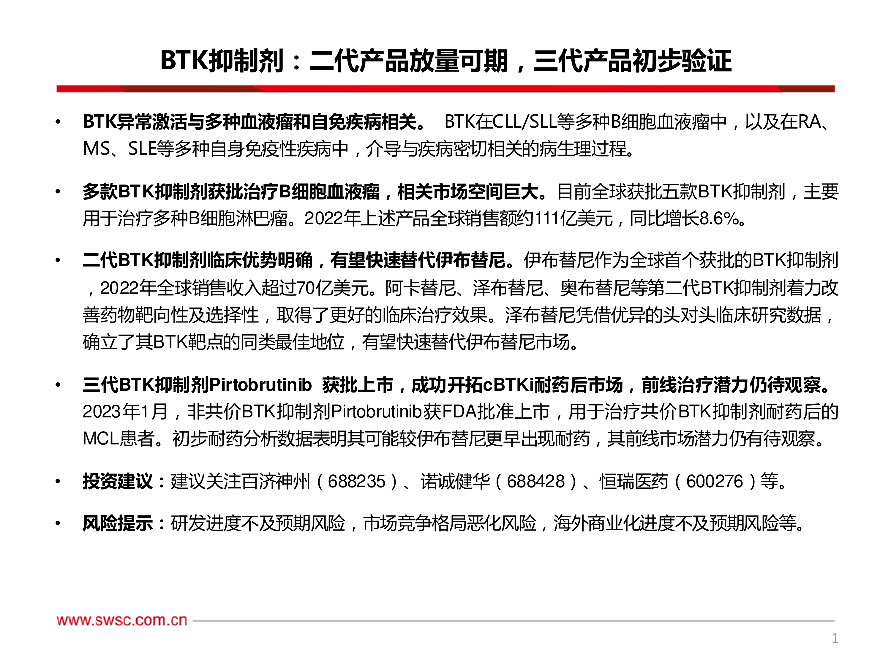 本报告的核心观点是:BTK抑制剂市场潜力巨大,二代产品放量可期,三代产品初步验证有效,但仍需进一步观察其长期疗效和耐药性。 具体而言: