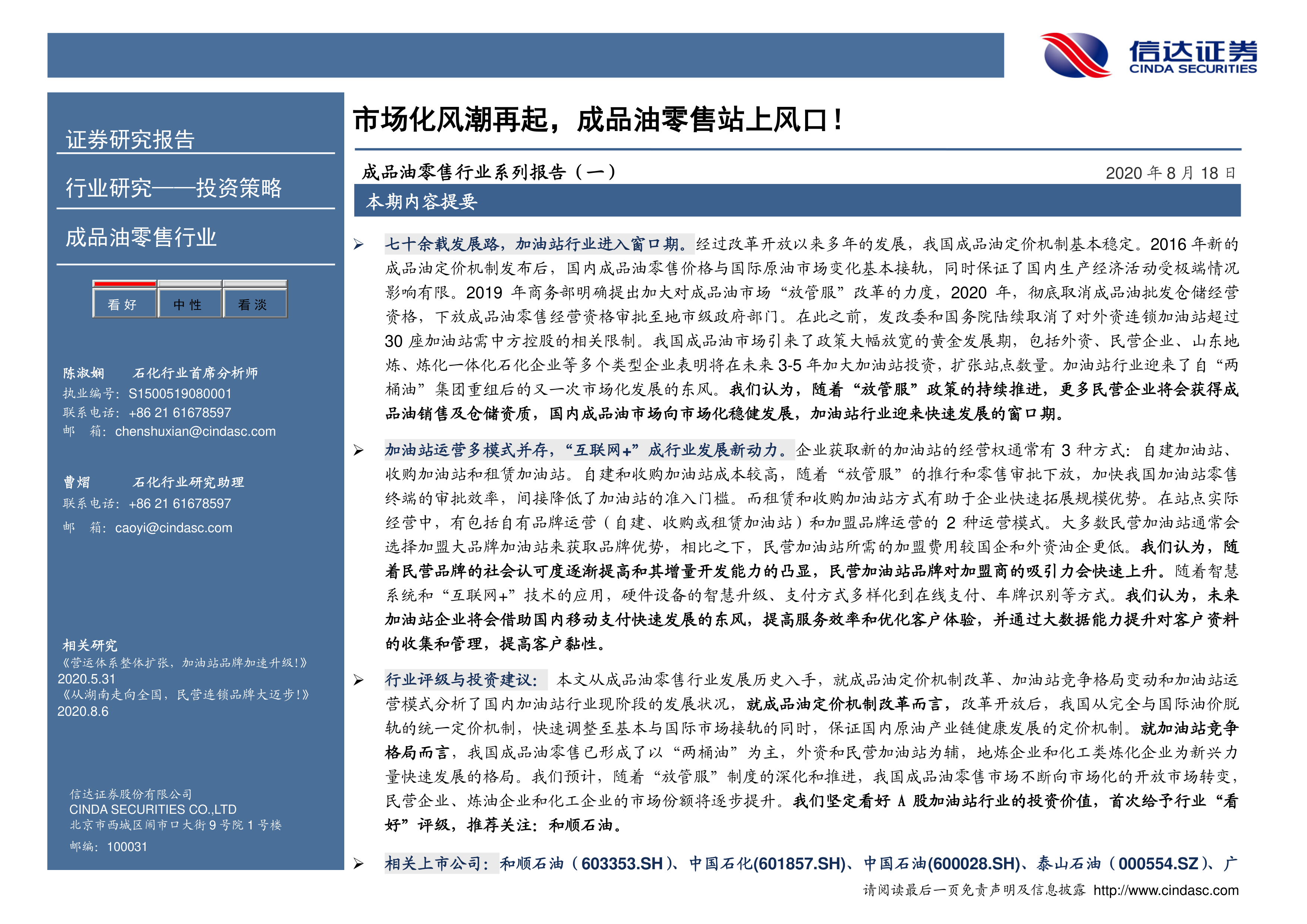 成品油零售行业系列报告(一):市场化风潮再起,成品油零售站上风口!