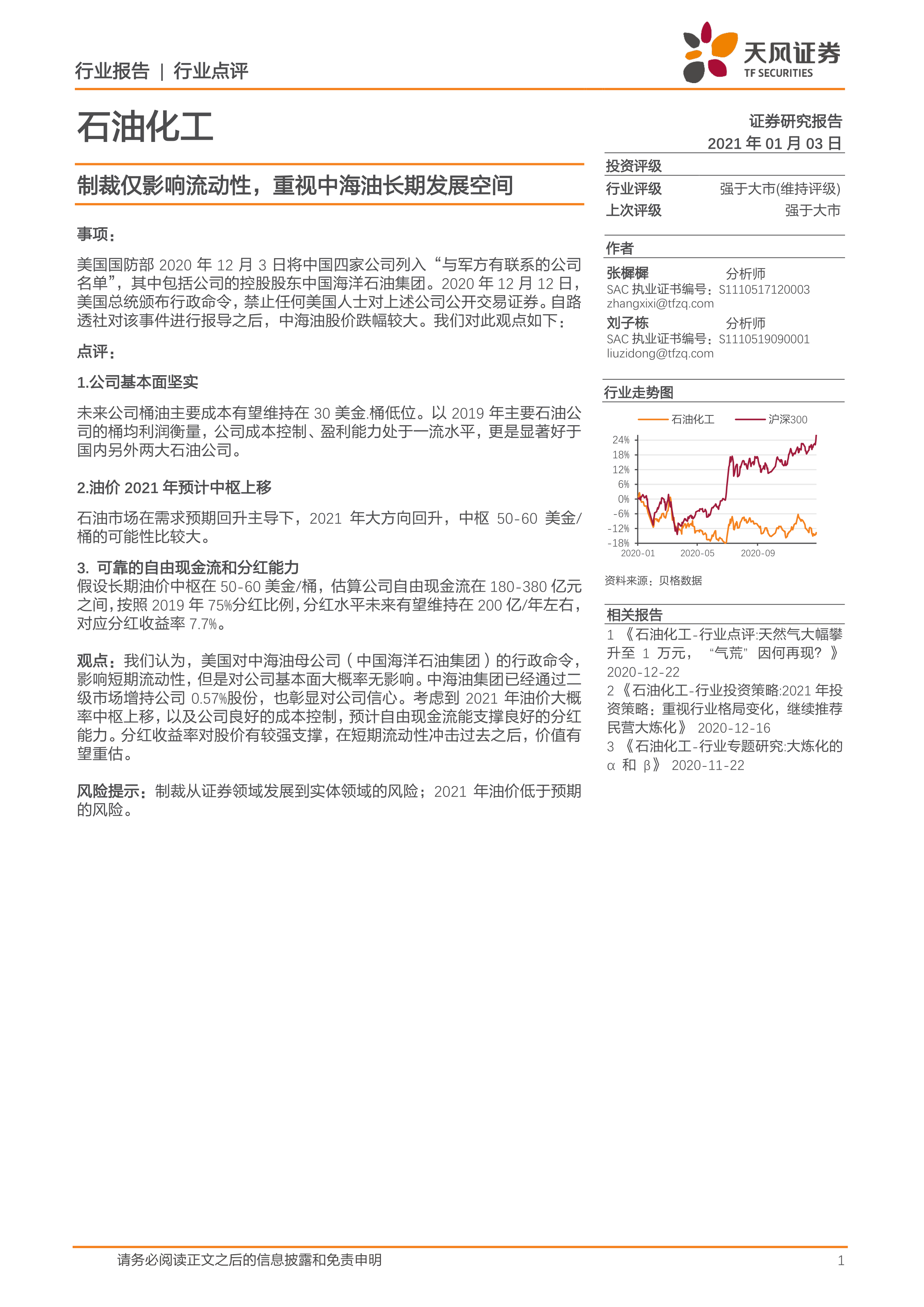 本报告基于对中海油公司基本面、2021年油价走势以及公司自由现金流和分红能力的分析,得出结论:美国对中海油母公司的制裁主要影响短期流动性,对公司长期基本面影响有限。中海油拥有坚实的基本面、良好的成本控制能力以及可靠的自由现金流和分红能力,2021年油价预计上行,这些因素都将支撑中海油的长期发展和股价价值重估。报告维持对中海油的“强于大市”评级。 然而,报告也指出了潜在的风险,例如制裁范围扩大以及油价低于预期的风险,投资者需谨慎关注。
