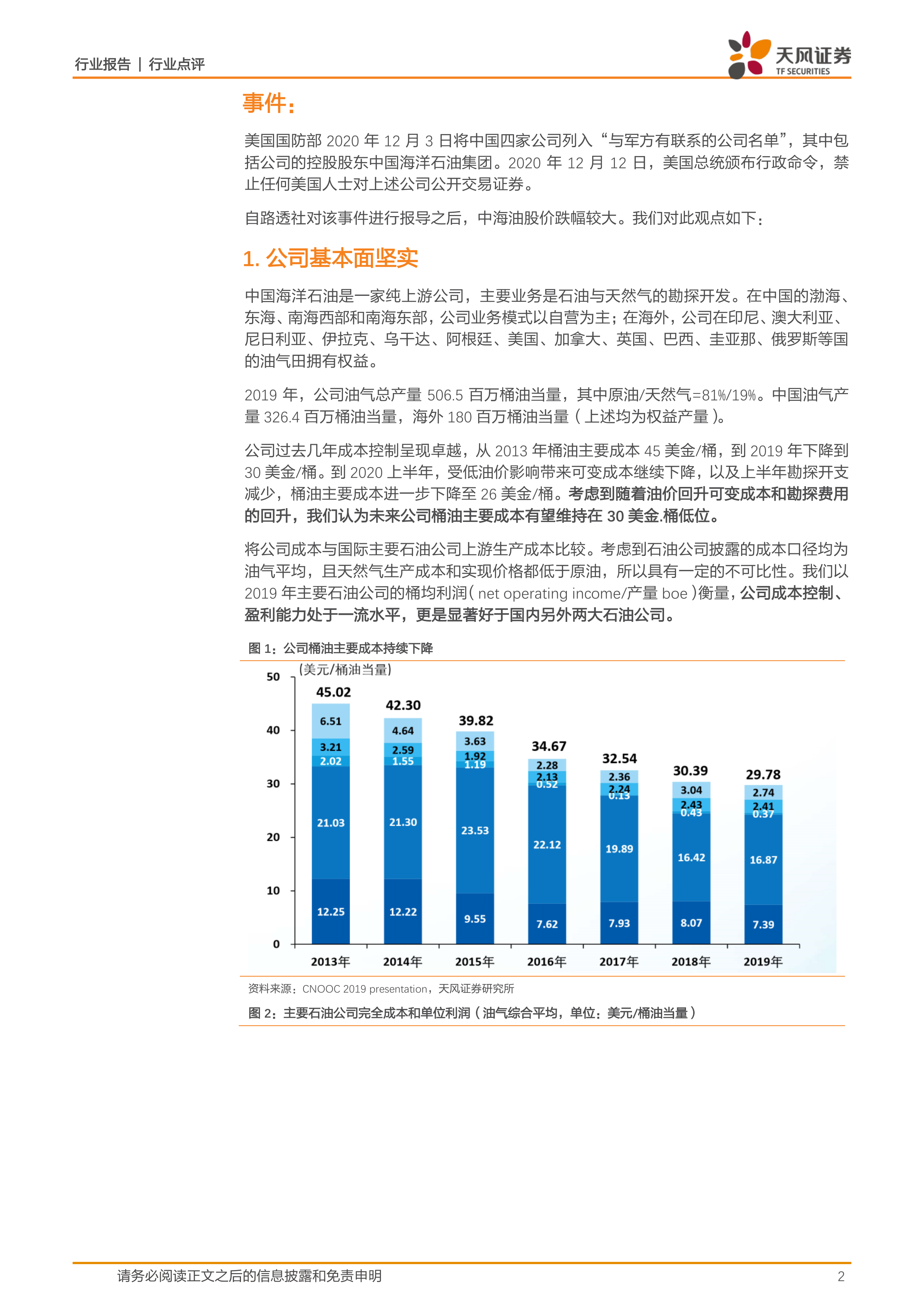 本报告的核心观点是:美国对中海油母公司(中国海洋石油集团)的制裁主要影响短期流动性,对公司基本面影响较小。中海油拥有坚实的基本面、良好的成本控制能力以及可靠的自由现金流和分红能力,2021年油价预计上行,这些因素都将支撑中海油的长期发展和股价价值重估。