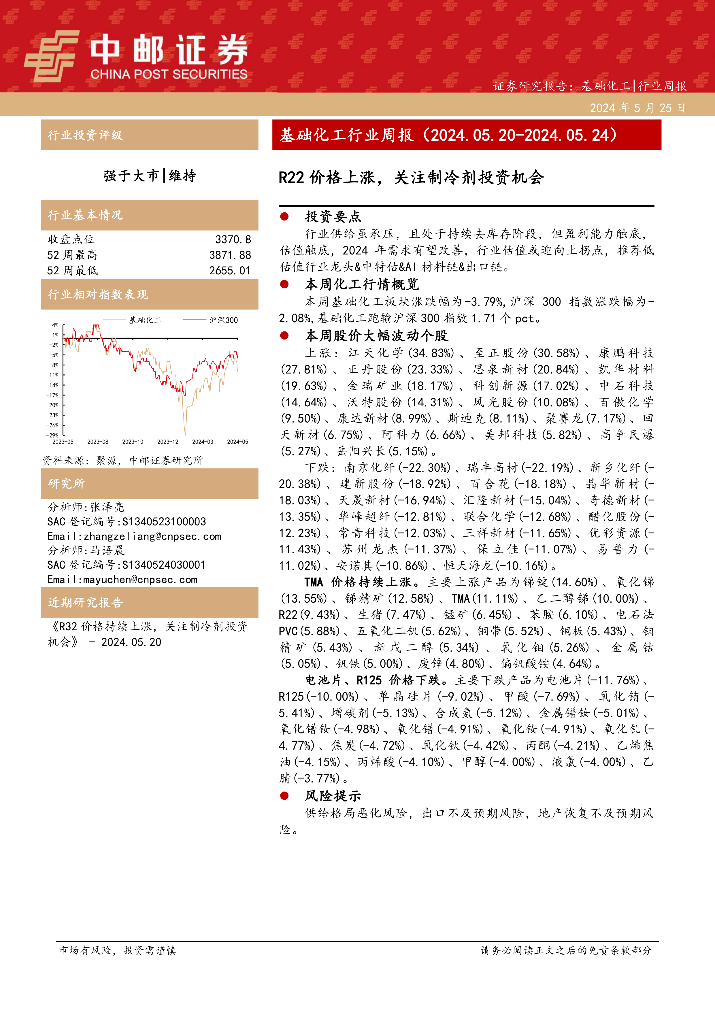 基础化工行业周报:R22价格上涨,关注制冷剂投资机会