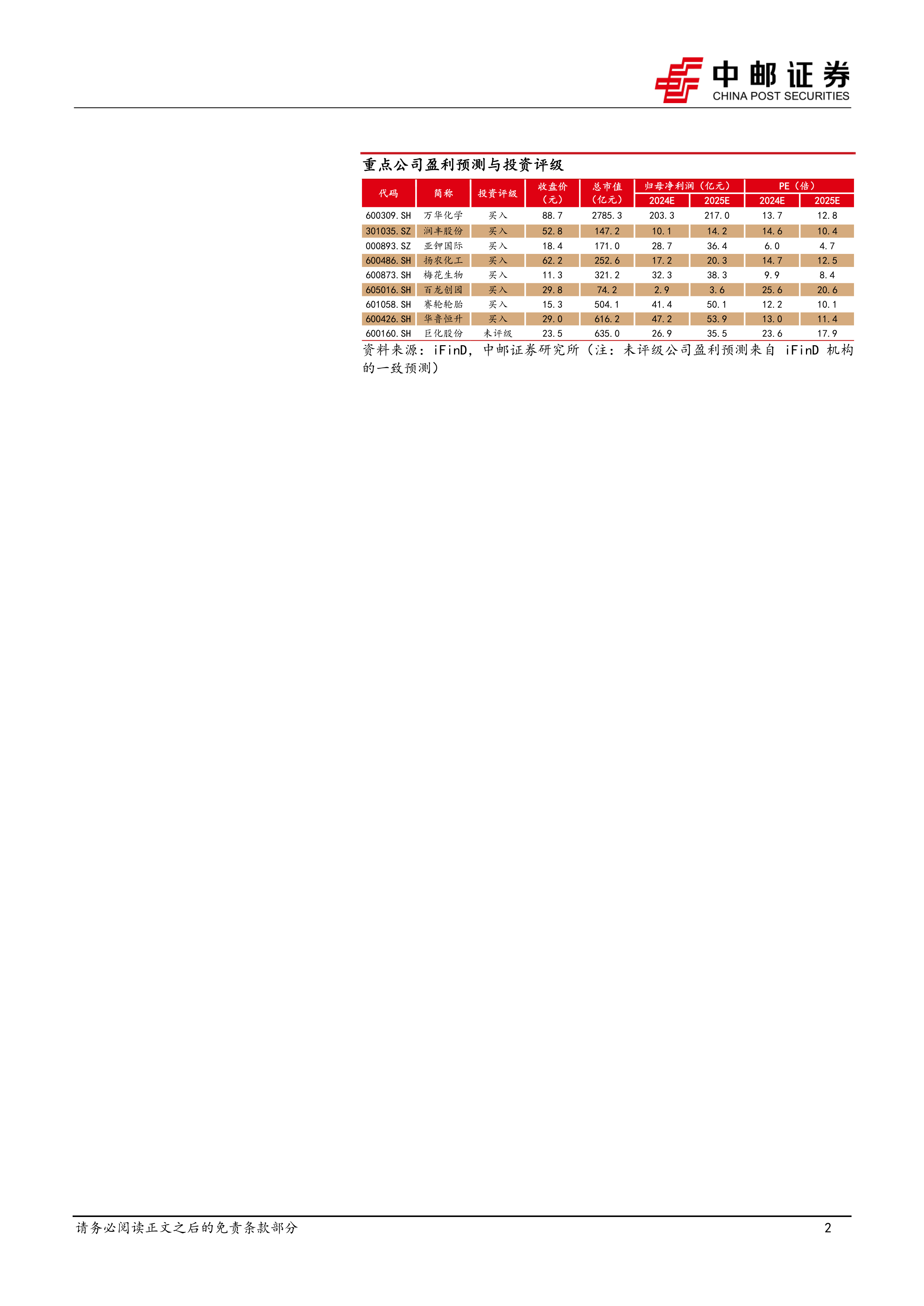 本报告的核心观点是基础化工行业正处于底部运行阶段,但拐点可期。尽管行业供给承压,去库存仍在持续,盈利能力触底,但2024年需求有望改善,行业估值或将迎来向上拐点。报告建议关注低估值行业龙头、中特估、AI材料链和出口链的投资机会。