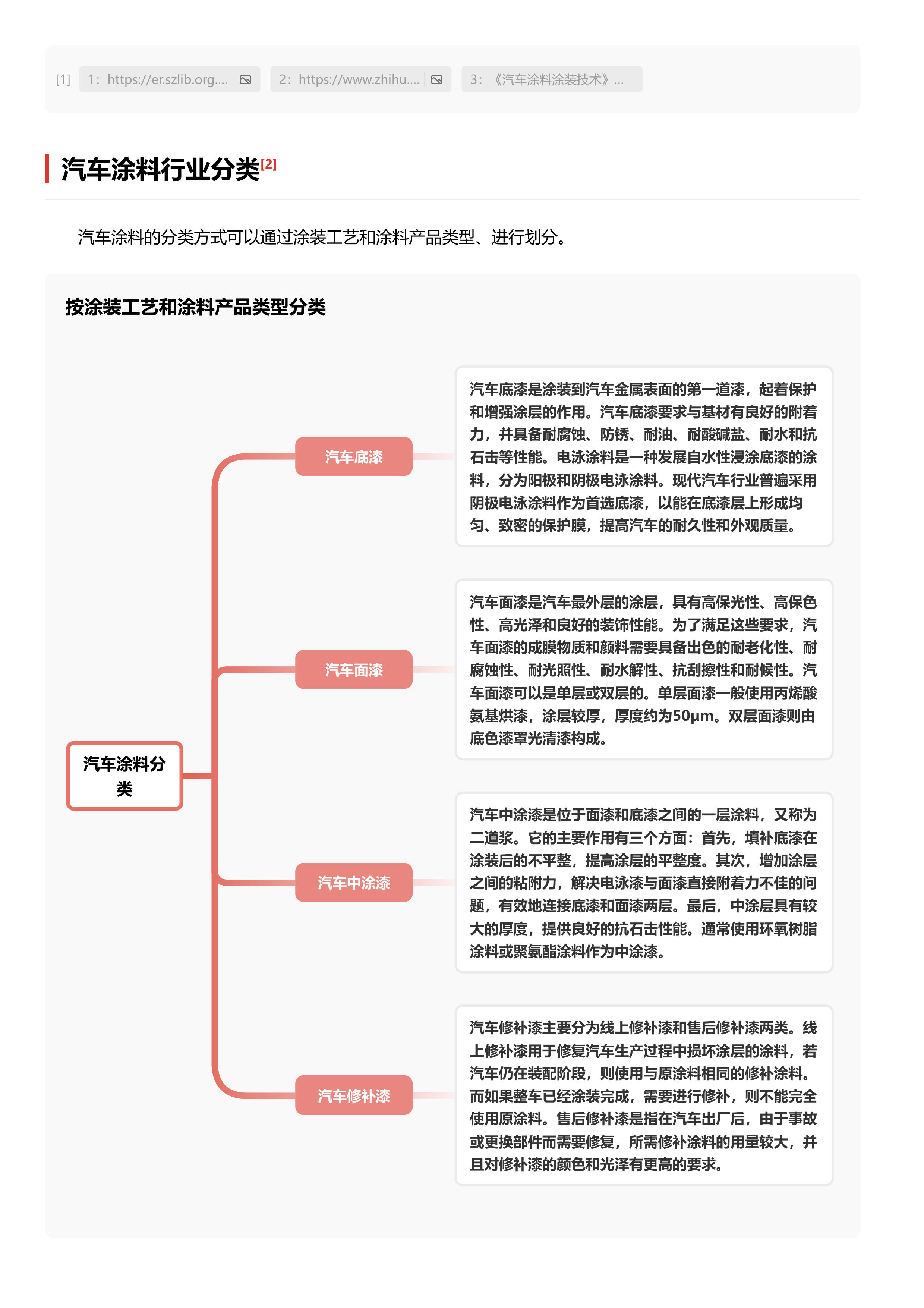 汽车涂料是指汽车制造和维修过程中使用的涂料,具有高耐腐蚀性和高装饰性。其分类方式可以根据涂装工艺和涂料产品类型(底漆、中涂漆、面漆、修补漆)或溶解介质(油性涂料、水性涂料)进行划分。 报告详细描述了各种类型汽车涂料的特点和用途。