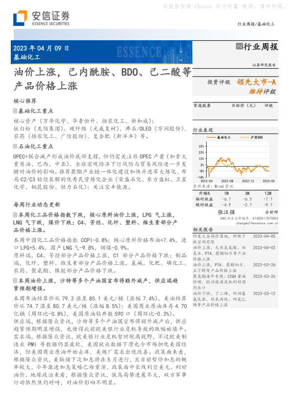 基础化工行业周报:油价上涨,己内酰胺、BDO、己二酸等产品价格上涨