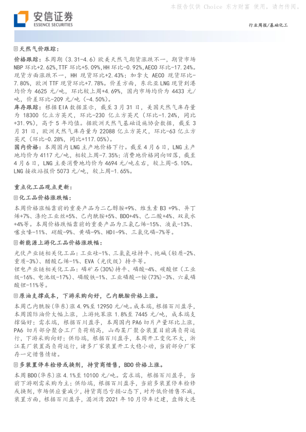 本周己内酰胺价格上涨 4.9%,主要原因是国际油价上涨导致上游纯苯价格上涨,以及下游 PA6 切片产量环比上涨,下游采购向好。