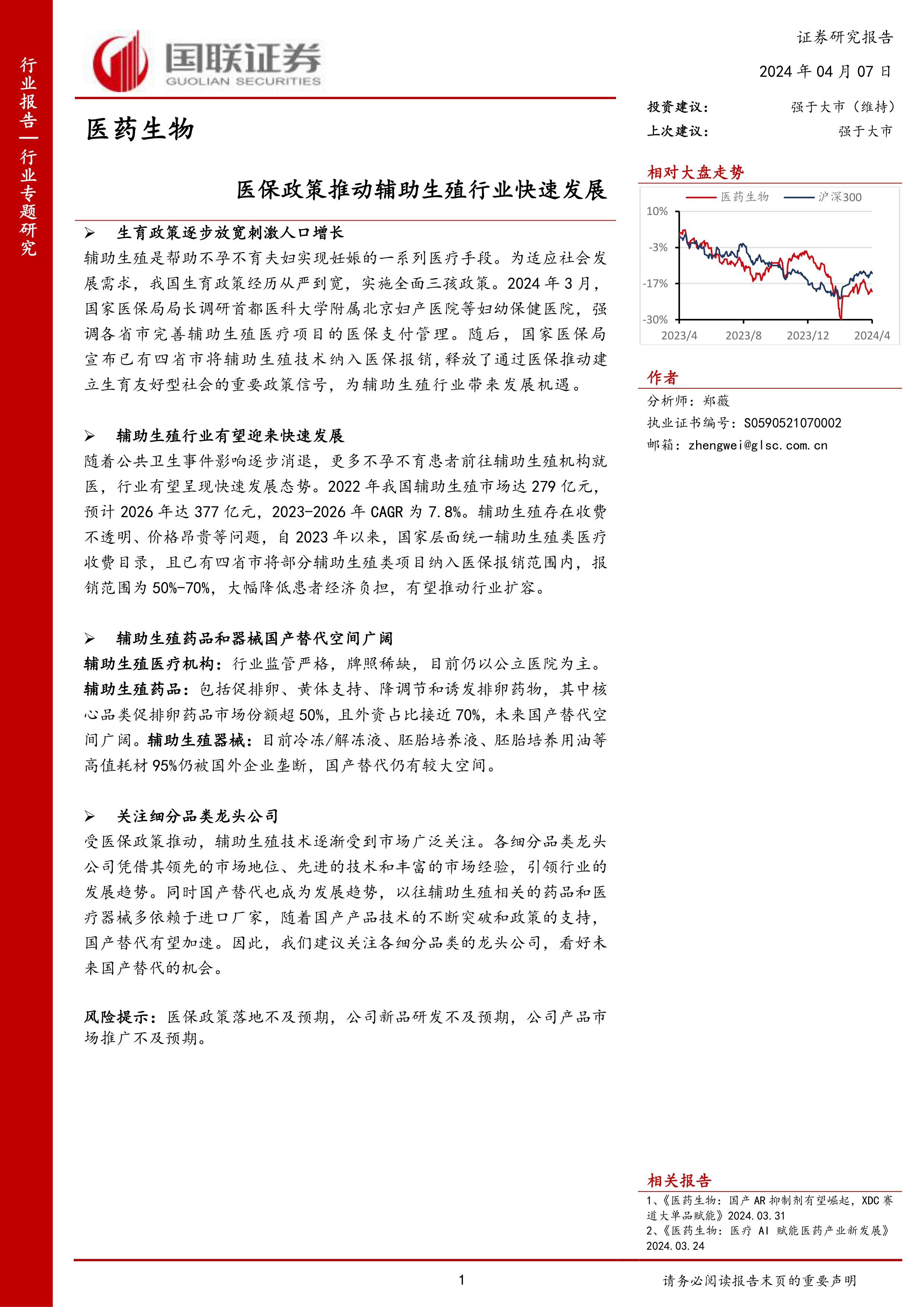 本报告基于国家生育政策的调整和医保政策的积极变化,对辅助生殖行业的发展前景进行了分析。报告指出,辅助生殖市场规模将持续扩大,国产替代空间广阔,建议投资者关注细分品类龙头公司,同时需注意潜在的市场风险。 报告详细分析了辅助生殖产业链的各个环节,包括医疗服务机构、药品和医疗器械,并对相关上市公司进行了梳理和评价,为投资者提供了较为全面的行业分析和投资建议。 然而,报告也强调了医保政策落地、产品研发和市场推广等方面的风险,投资者需谨慎评估。
