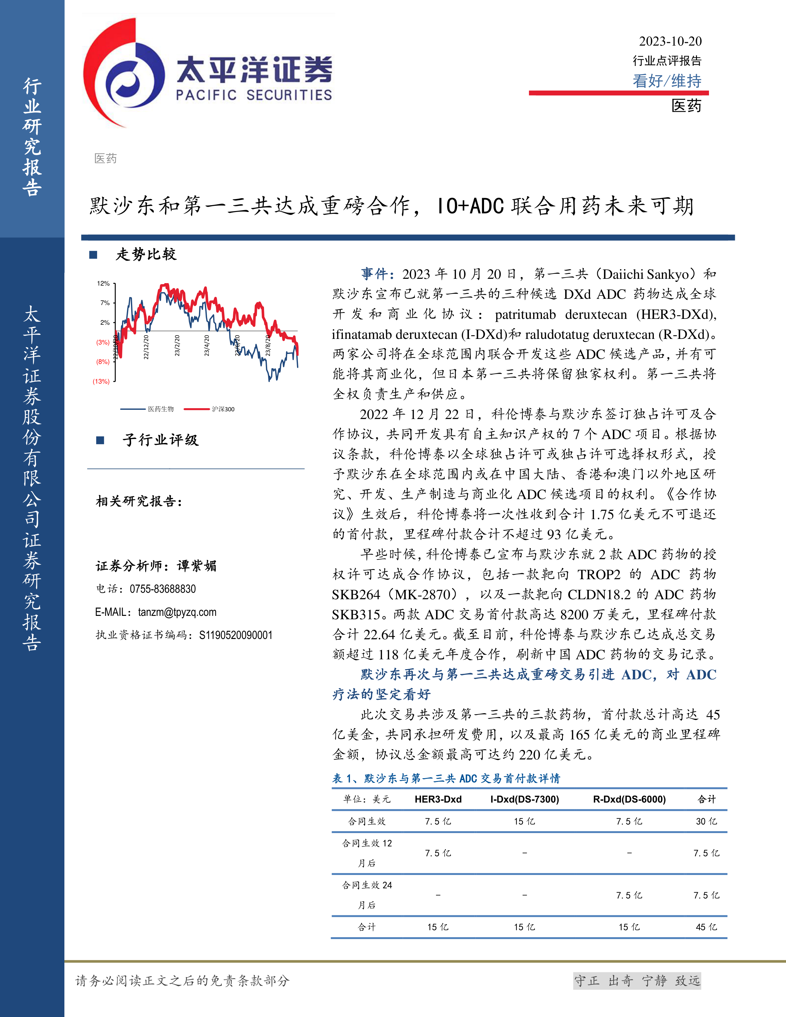 事件:2023年10月20日,第一三共(DaiichiSankyo)和默沙东宣布已就第一三共的三种候选DXdADC药物达成全球开发和商业化协议:patritumabderuxtecan(HER3-DXd).ifinatamabderuxtecan(-DXd)和raludotatugderuxtecan(R-DXd)c两家公司将在全球范围内联合开发这些ADC候选产品,并有可能将其商业化,但日本第一三共将保留独家权利。第一三共将全权负责生产和供应。