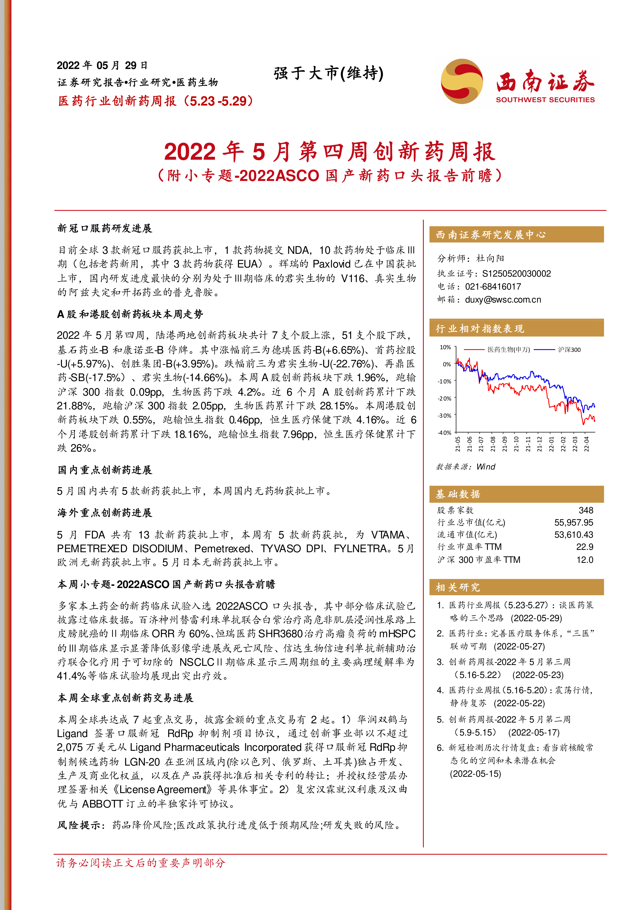 本报告的核心观点是:2022年5月第四周,A股和港股创新药板块表现分化,A股跑输沪深300指数,港股跑输恒生指数。新冠口服药研发进展迅速,国内外多款药物进入临床III期或获批上市,但市场整体表现受多种因素影响,存在一定风险。ASCO大会上,多家中国药企的新药临床试验数据值得关注。