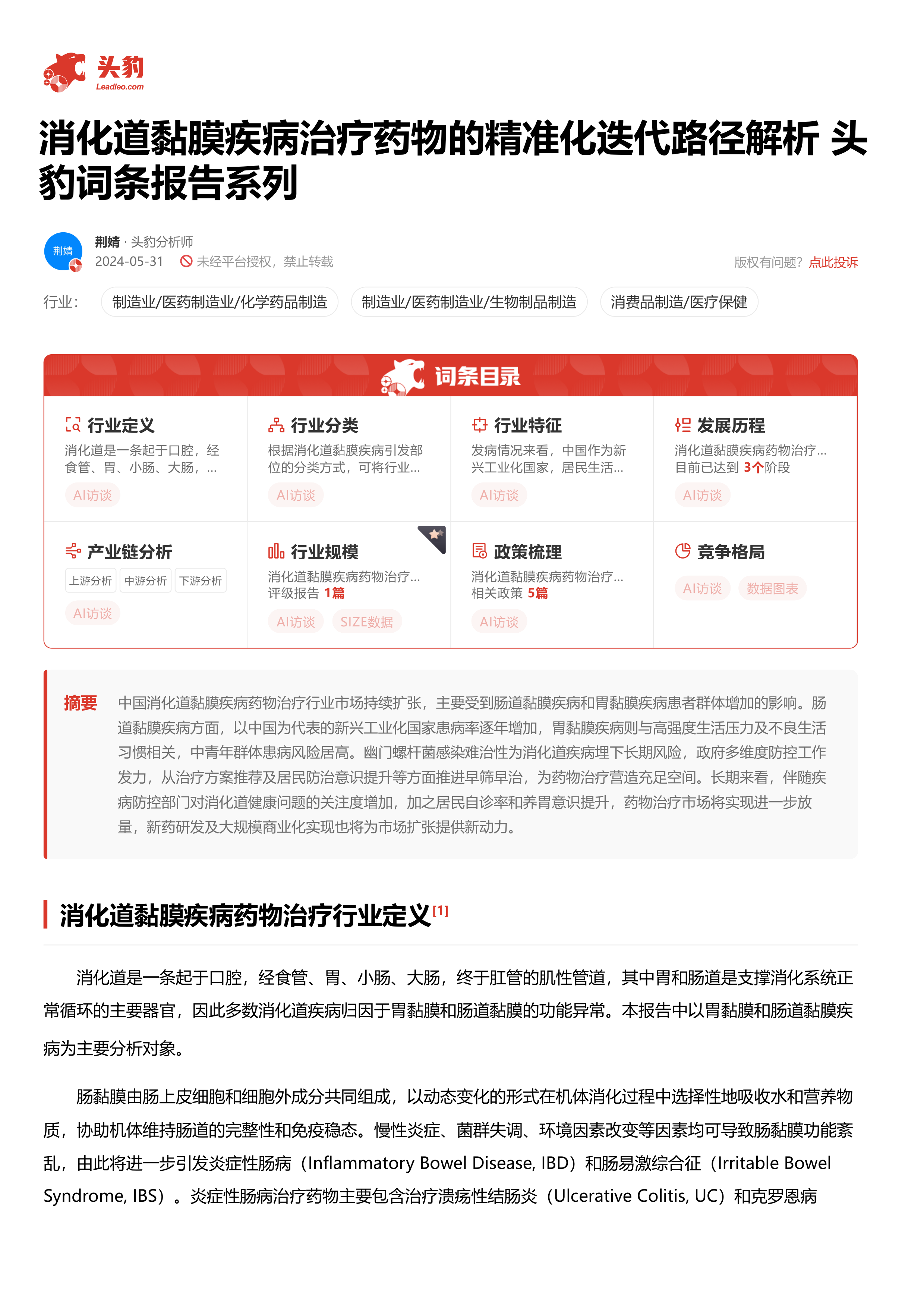 消化道黏膜疾病治疗药物的精准化迭代路径解析 头豹词条报告系列