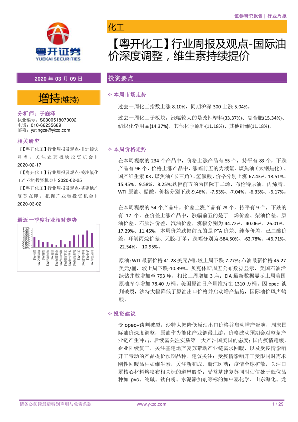 本报告为粤开证券化工行业周报,主要内容涵盖本周化工市场走势、化学品价格走势分析以及投资建议。