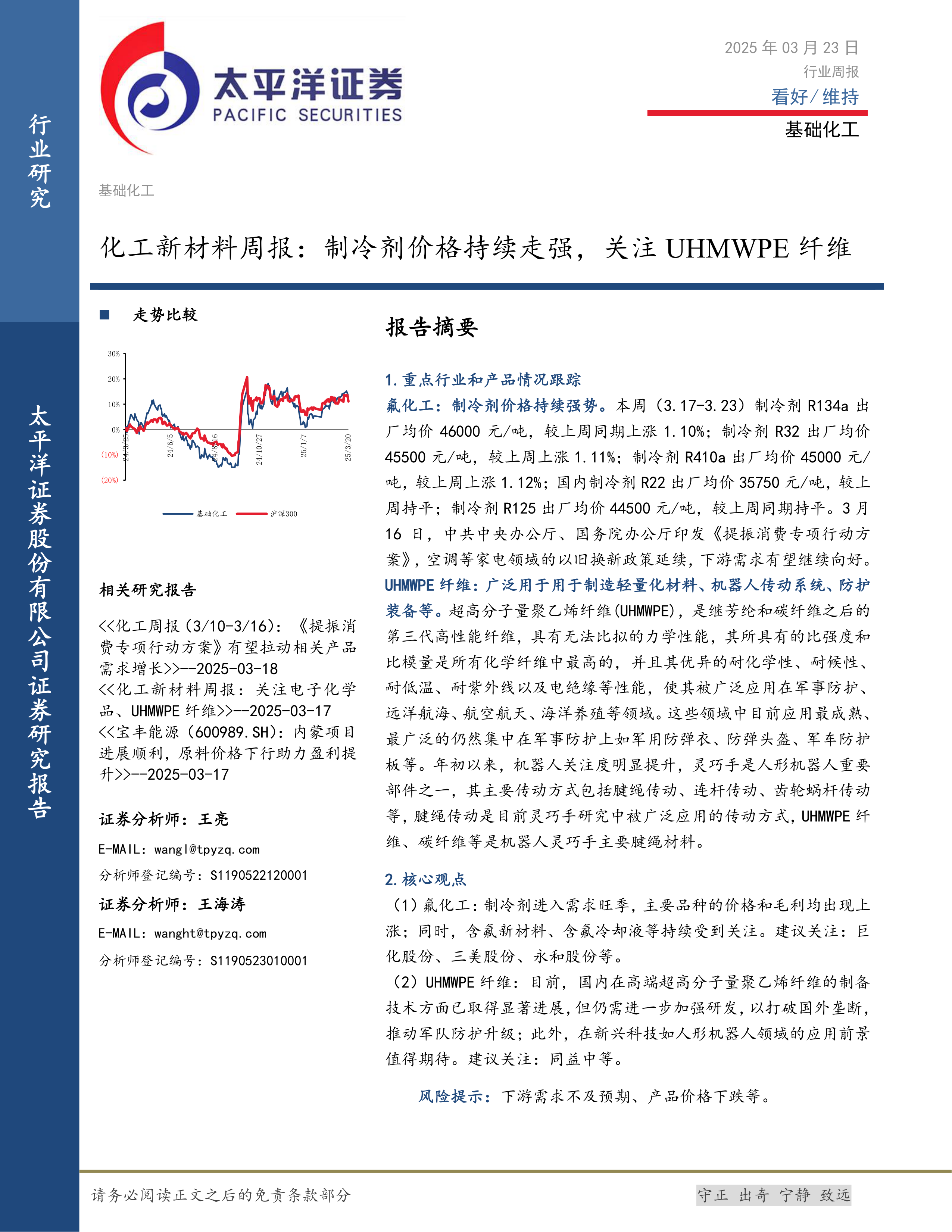 本报告对基础化工行业,特别是化工新材料领域的市场进行了全面的分析。制冷剂价格持续走强,UHMWPE纤维应用前景广阔,但下游需求和价格波动仍是潜在风险。投资者需密切关注市场动态,谨慎决策。 报告中提供的图表数据和公司分析,为投资者提供了重要的参考信息。 需要注意的是,本报告仅供参考,不构成投资建议。