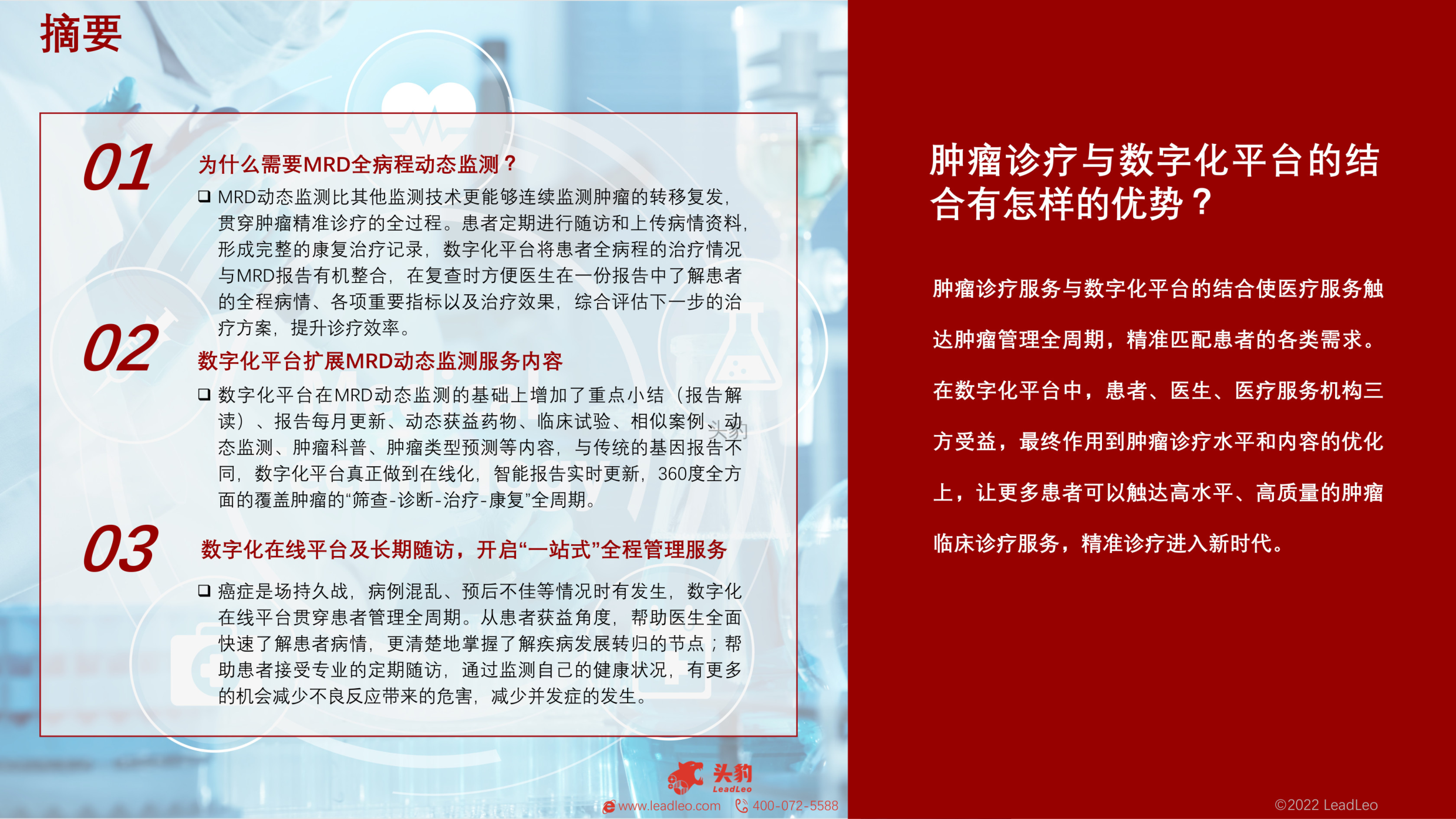 数字化平台在MRD动态监测的基础上增加了重点小结(报告解读)、报告每月更新、动态获益药物、临床试验、相似案例动态监测、肿瘤科普、肿瘤类型预测等内容,与传统的基因报告不司,数字化平台真正做到在线化,智能报告实时更新,360度全方面的覆盖肿瘤的“筛查-诊断-治疗-康复全周期。