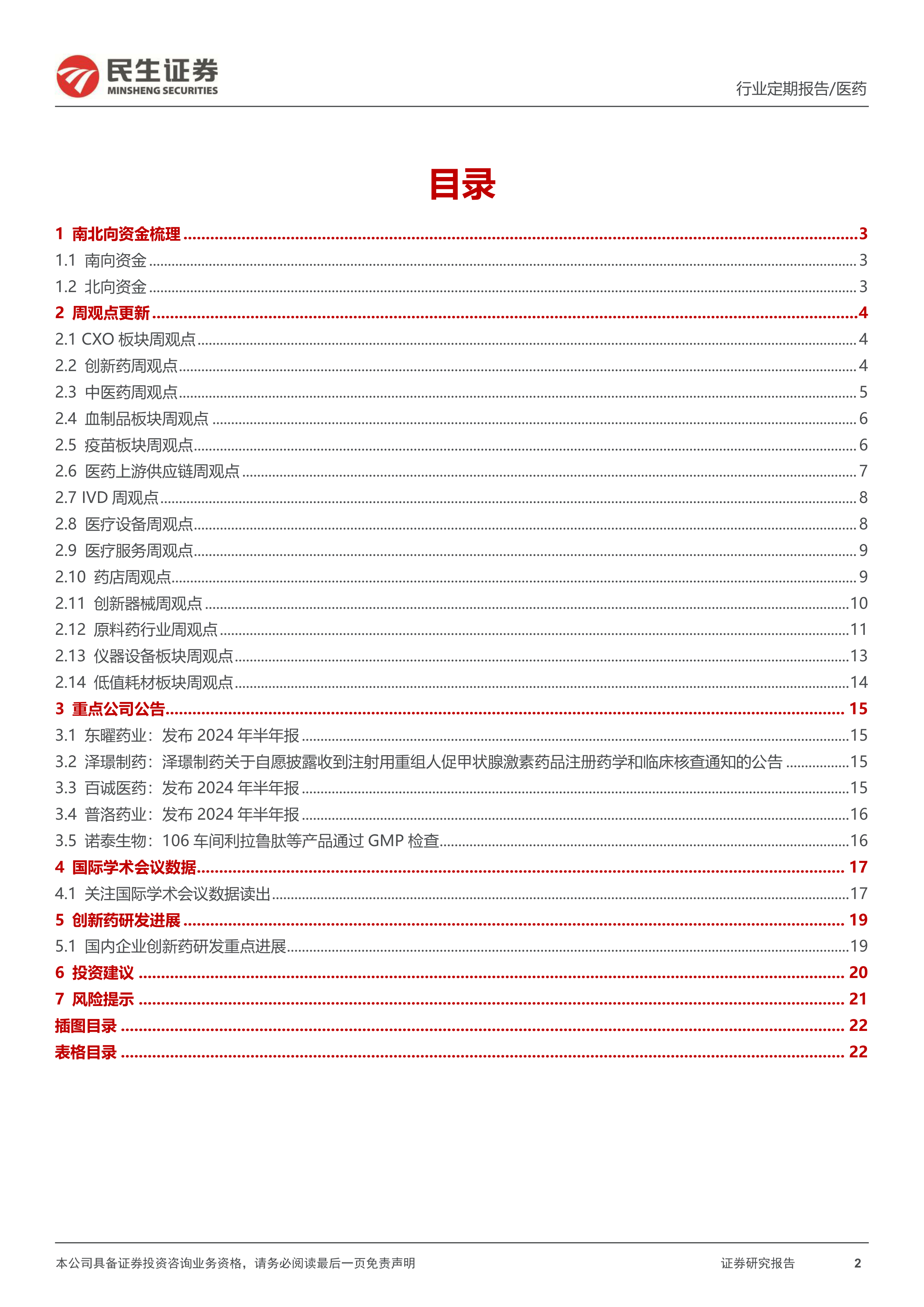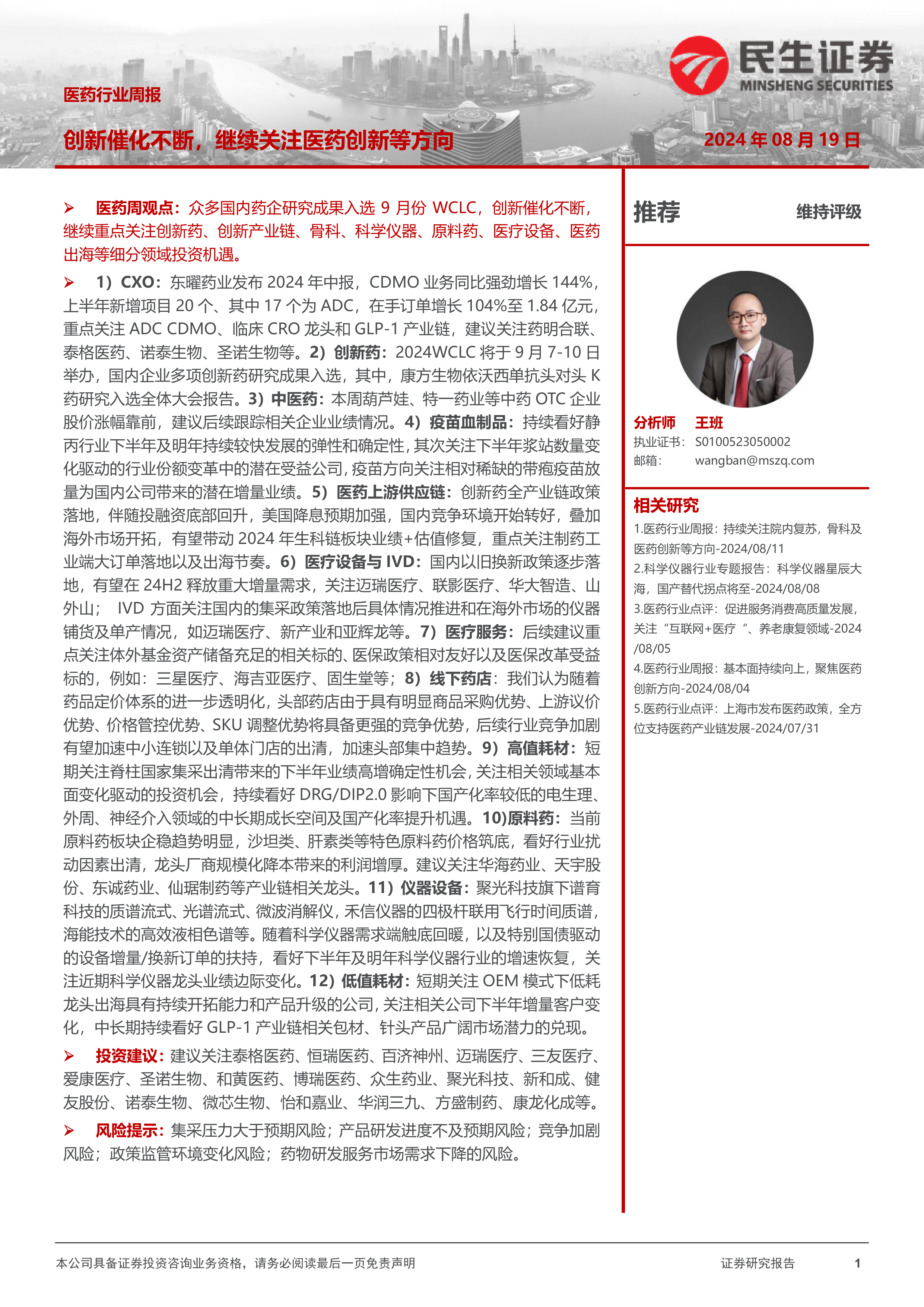 1)CXO:东曜药业发布2024年中报,CDMO业务同比强劲增长144%,上半年新增项目20个、其中17个为ADC,在手订单增长104%至1.84亿元,重点关注ADC CDMO、临床CRO龙头和GLP-1产业链,建议关注药明合联、泰格医药、诺泰生物、圣诺生物等。2)创新药:2024WCLC将于9月7-10日举办,国内企业多项创新药研究成果入选,其中,康方生物依沃西单抗头对头K药研究入选全体大会报告。3)中医药:本周葫芦娃、特一药业等中药OTC企业股价涨幅靠前,建议后续跟踪相关企业业绩情况。4)疫苗血制品:持续看好静丙行业下半年及明年持续较快发展的弹性和确定性,其次关注下半年浆站数量变化驱动的行业份额变革中的潜在受益公司,疫苗方向关注相对稀缺的带疱疫苗放量为国内公司带来的潜在增量业绩。5)医药上游供应链:创新药全产业链政策落地,伴随投融资底部回升,美国降息预期加强,国内竞争环境开始转好,叠加海外市场开拓,有望带动2024年生科链板块业绩+估值修复,重点关注制药工业端大订单落地以及出海节奏。6)医疗设备与IVD:国内以旧换新政策逐步落地,有望在24H2释放重大增量需求,关注迈瑞医疗、联影医疗、华大智造、山外山;IVD方面关注国内的集采政策落地后具体情况推进和在海外市场的仪器铺货及单产情况,如迈瑞医疗、新产业和亚辉龙等。7)医疗服务:后续建议重点关注体外基金资产储备充足的相关标的、医保政策相对友好以及医保改革受益标的,例如:三星医疗、海吉亚医疗、固生堂等;8)线下药店:我们认为随着药品定价体系的进一步透明化,头部药店由于具有明显商品采购优势、上游议价优势、价格管控优势、SKU调整优势将具备更强的竞争优势,后续行业竞争加剧有望加速中小连锁以及单体门店的出清,加速头部集中趋势。9)高值耗材:短期关注脊柱国家集采出清带来的下半年业绩高增确定性机会,关注相关领域基本面变化驱动的投资机会,持续看好DRG/DIP2.0影响下国产化率较低的电生理、外周、神经介入领域的中长期成长空间及国产化率提升机遇。10)原料药:当前原料药板块企稳趋势明显,沙坦类、肝素类等特色原料药价格筑底,看好行业扰动因素出清,龙头厂商规模化降本带来的利润增厚。建议关注华海药业、天宇股份、东诚药业、仙琚制药等产业链相关龙头。11)仪器设备:聚光科技旗下谱育科技的质谱流式、光谱流式、微波消解仪,禾信仪器的四极杆联用飞行时间质谱,海能技术的高效液相色谱等。随着科学仪器需求端触底回暖,以及特别国债驱动的设备增量/换新订单的扶持,看好下半年及明年科学仪器行业的增速恢复,关注近期科学仪器龙头业绩边际变化。12)低值耗材:短期关注OEM模式下低耗龙头出海具有持续开拓能力和产品升级的公司,关注相关公司下半年增量客户变化,中长期持续看好GLP-1产业链相关包材、针头产品广阔市场潜力的兑现。