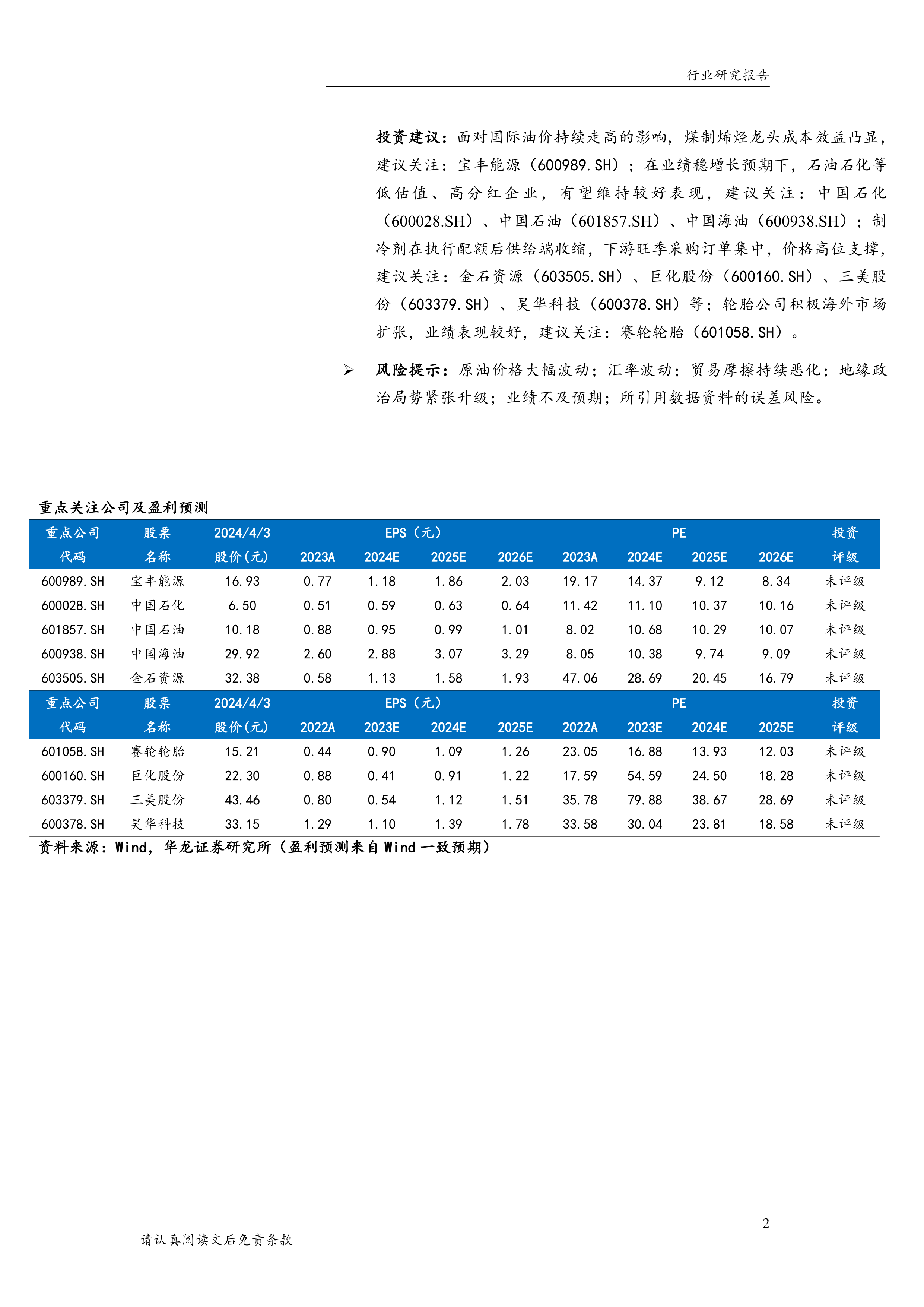 报告最后列出了潜在的风险因素,包括原油价格大幅波动、汇率波动、贸易摩擦、地缘政治局势紧张、公司业绩不及预期以及数据资料误差等,提醒投资者注意投资风险。