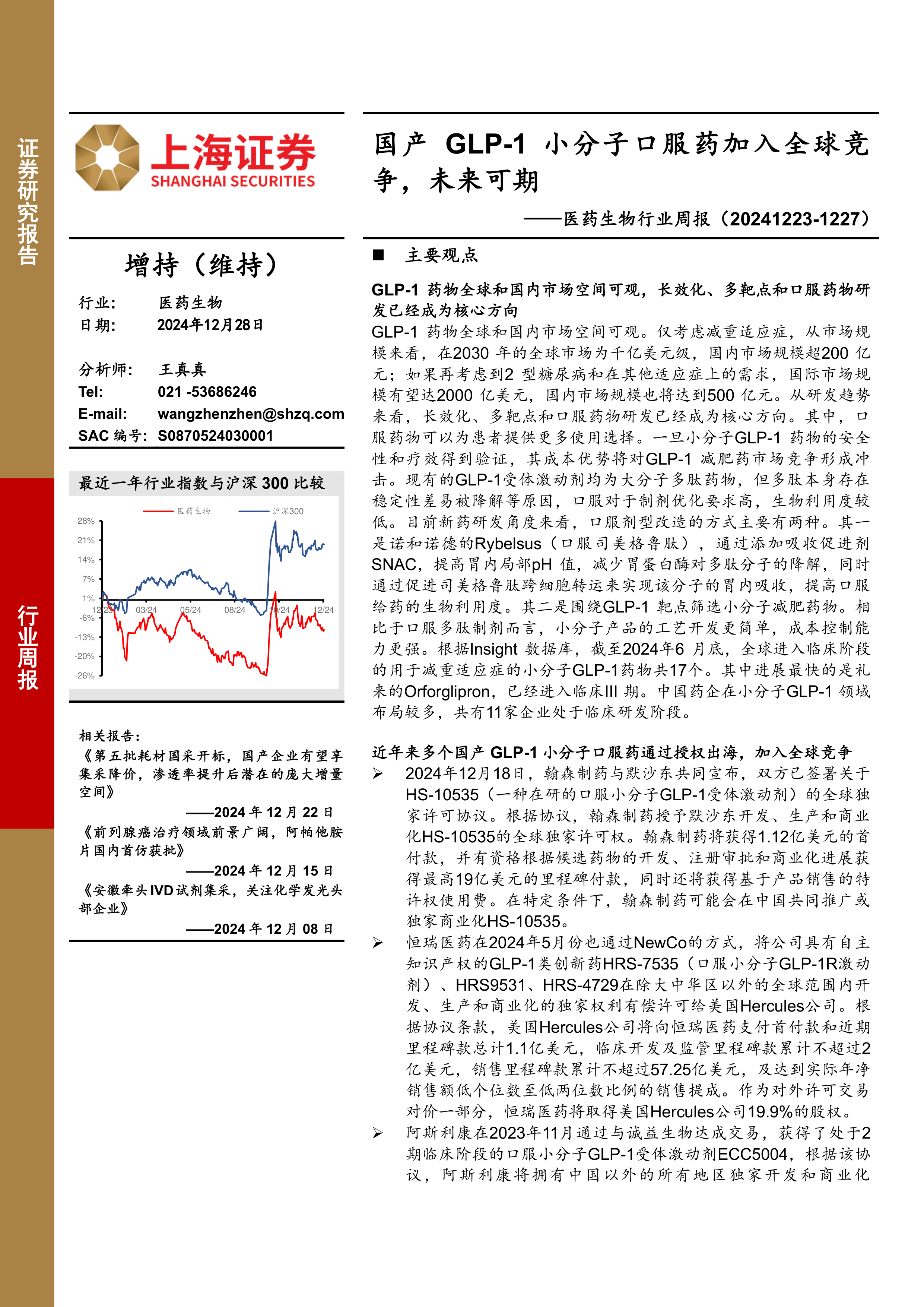 医药生物行业周报:国产GLP-1小分子口服药加入全球竞争,未来可期