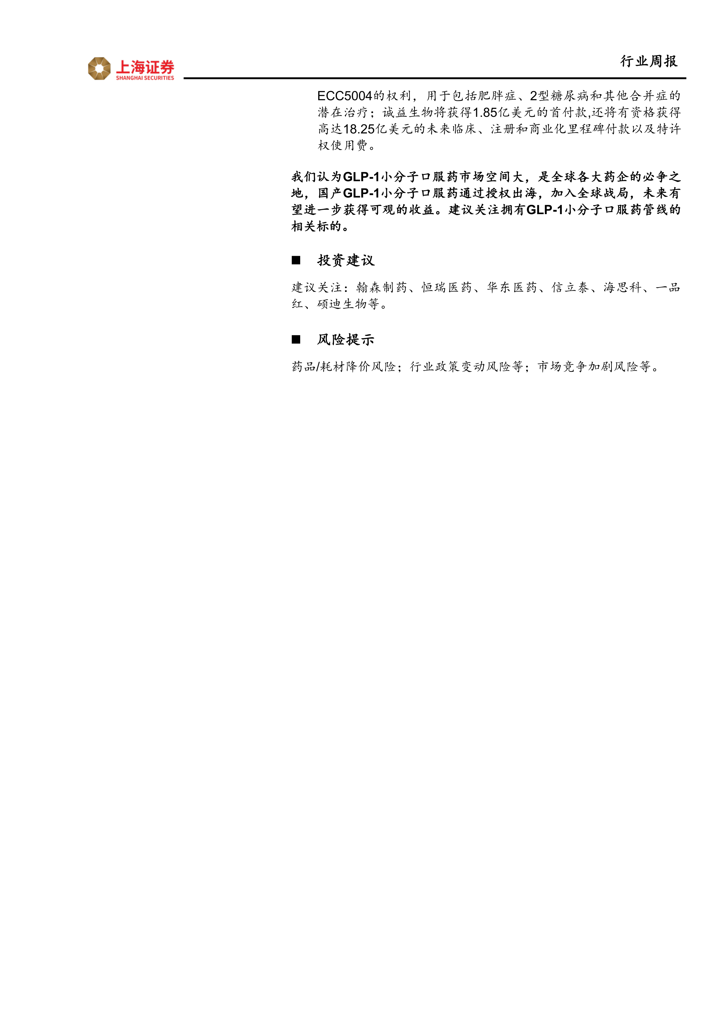 报告最后给出了投资建议,建议关注翰森制药、恒瑞医药、华东医药、信立泰、海思科、一品红、硕迪生物等拥有GLP-1小分子口服药管线的相关标的。 同时,报告也提示了药品/耗材降价风险、行业政策变动风险以及市场竞争加剧风险等潜在风险。