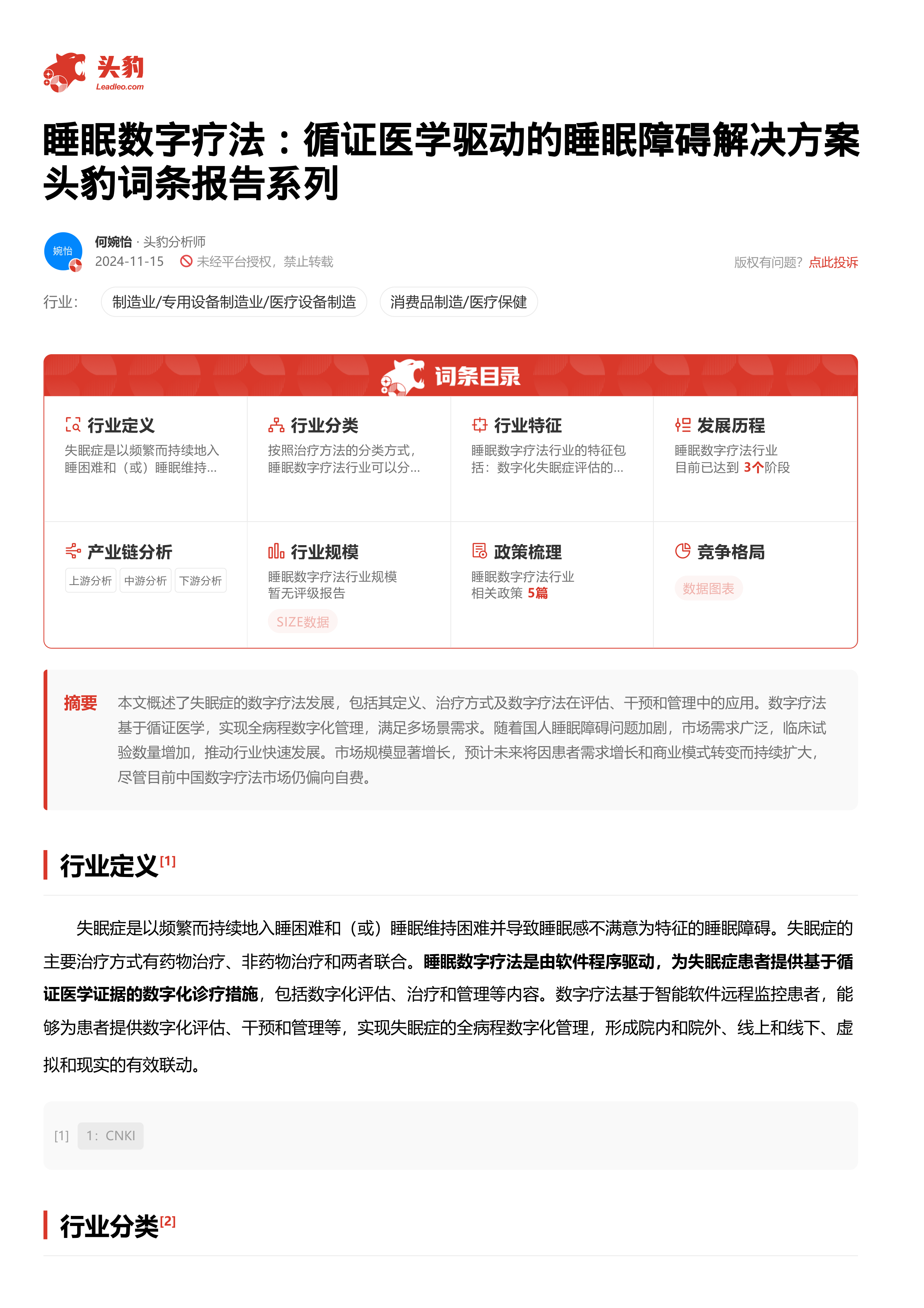 睡眠数字疗法:循证医学驱动的睡眠障碍解决方案 头豹词条报告系列