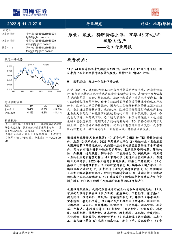 长期推荐及关注:我们仍然重点看好被低估的各细分领域龙头:1)民营炼化及涤纶长丝企业(恒力石化、荣盛石化、卫星化学、东方盛虹、桐昆股份、恒逸石化、新凤鸣、东华能源等);2)煤化工(华鲁恒升、宝丰能源、鲁西化工等);3)磷化工产业链企业(新洋丰、川恒股份、云图控股、云天化、兴发集团、芭田股份、川发龙蟒、湖北宜化、川金诺、中毅达、粤桂股份等);4)新材料(国瓷材料、万润股份、利安隆、凯赛生物、信德新材、道恩股份、雅克科技、江化微、金发科技、巨化股份、盐湖股份、泰和新材等);5)纯碱行业(远兴能源、三友化工、山东海化等);6)农药(扬农化工、利尔化学、国光股份);7)食品添加剂(新和成、金禾实业);8)钛白粉龙头龙佰集团;9)氨纶和己二酸龙头华峰化学;10)油脂化工龙头赞宇科技。