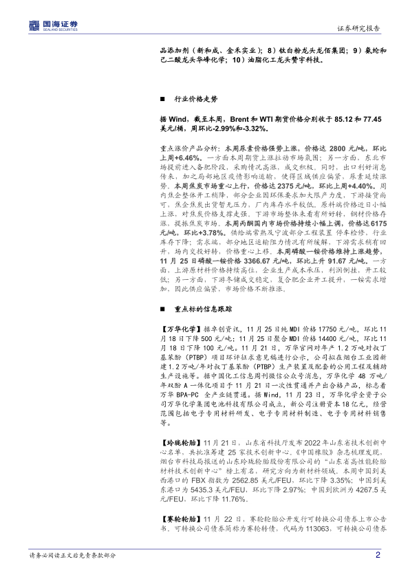 报告对万华化学、玲珑轮胎、赛轮轮胎、森麒麟、恒力石化、荣盛石化、东方盛虹、卫星化学、桐昆股份、新凤鸣、新洋丰、云图控股、中毅达、中国化学、龙佰集团、双箭股份、阳谷华泰、华峰化学、新和成、三友化工、华鲁恒升、宝丰能源、国瓷材料、瑞华泰、金禾实业、扬农化工、利尔化学、赞宇科技、长青股份、国光股份、道恩股份、金发科技、蓝晓科技、盐湖股份、万润股份、雅克科技、利安隆、粤桂股份、中化国际、楚江新材等多家重点化工公司的近期信息进行了跟踪,包括产品价格、产能、项目进展、市场份额等方面,并对部分公司进行了简要的投资建议。 这些信息涵盖了基础化工、石油化工、新材料、农药等多个细分领域。