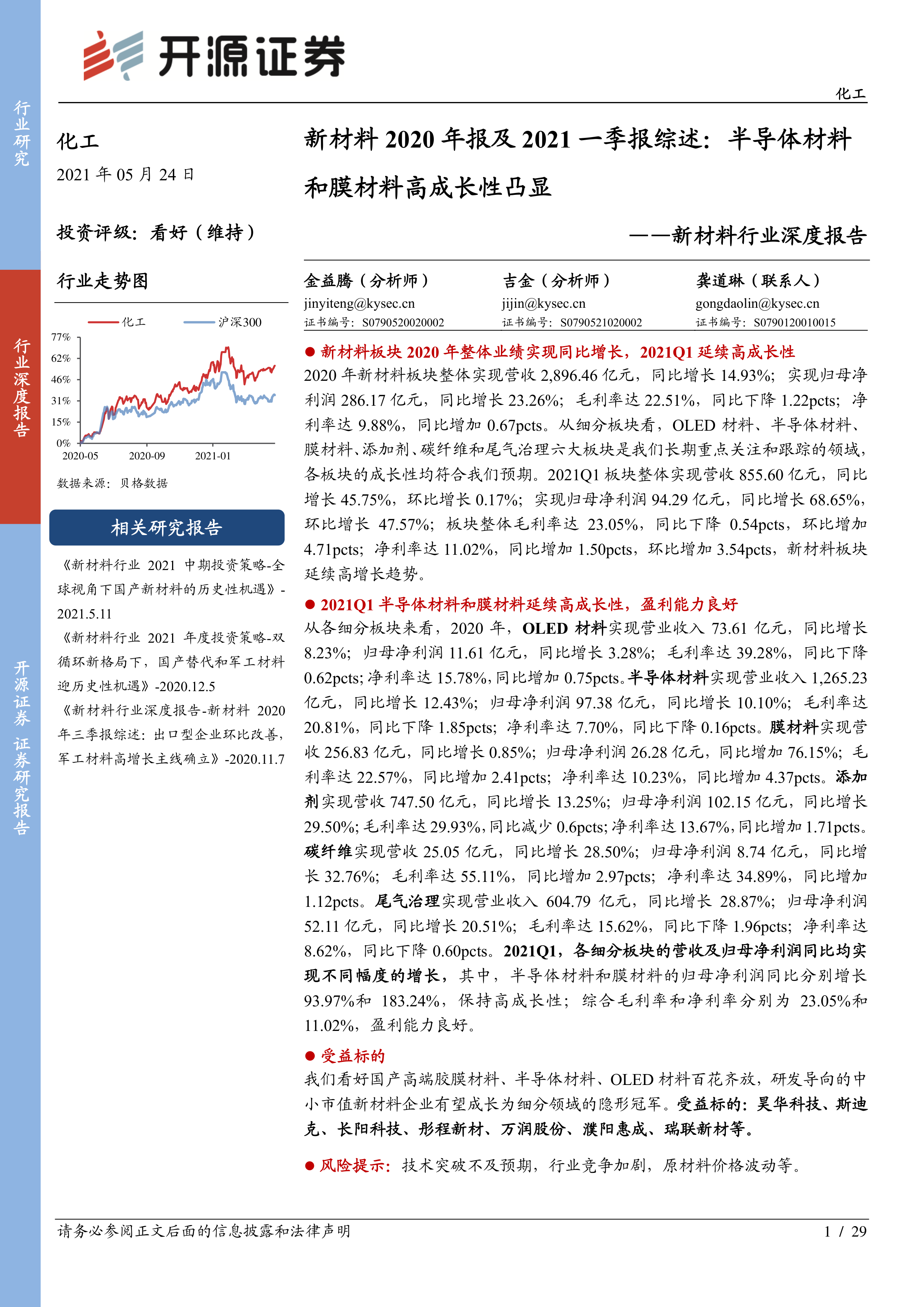 新材料行业深度报告:新材料2020年报及2021一季报综述:半导体材料和膜材料高成长性凸显