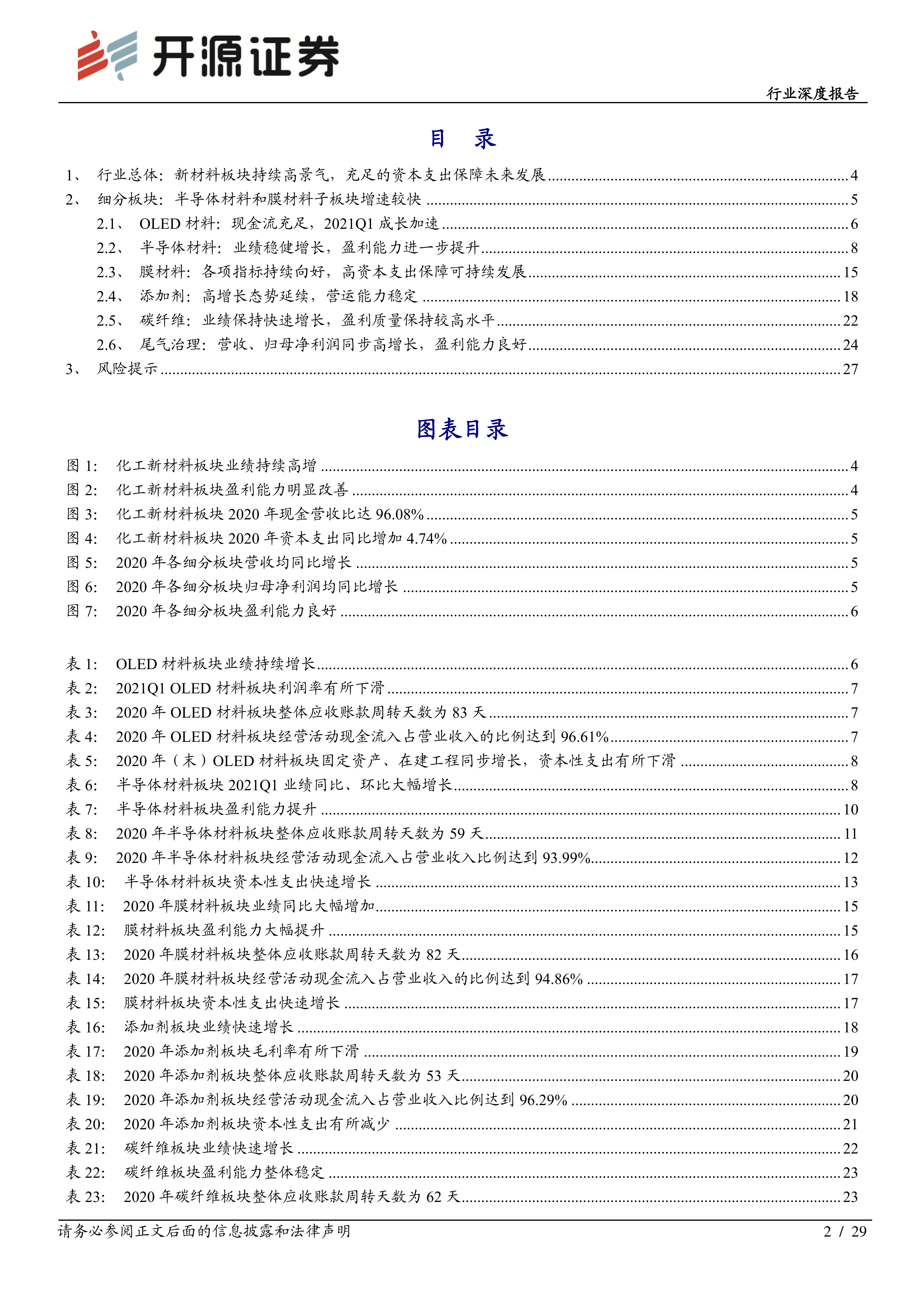 本报告按照目录结构,对中国化工新材料行业2020年年报及2021年第一季度报告进行了深入分析,涵盖行业总体情况及六大细分板块(OLED材料、半导体材料、膜材料、添加剂、碳纤维和尾气治理)的业绩表现、盈利能力、营运能力和资本支出情况。