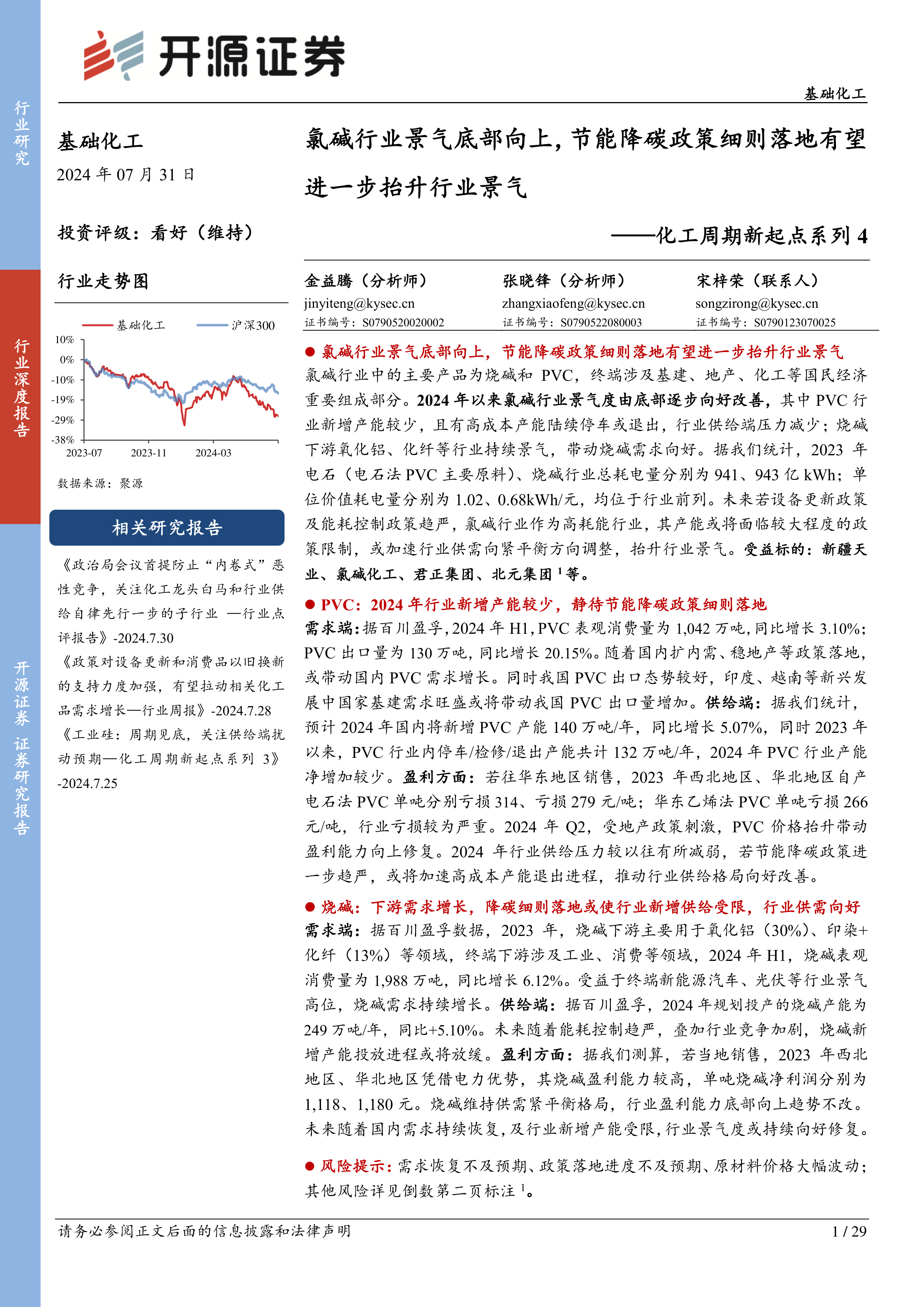 氯碱行业作为高耗能行业,其发展与国家节能降碳政策密切相关。报告指出,未来设备更新政策和能耗控制政策趋严,将加速行业落后产能的淘汰,推动供需向紧平衡方向调整,从而提升行业景气度。