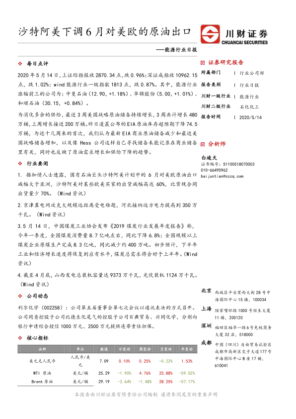 能源行业日报:沙特阿美下调6月对美欧的原油出口