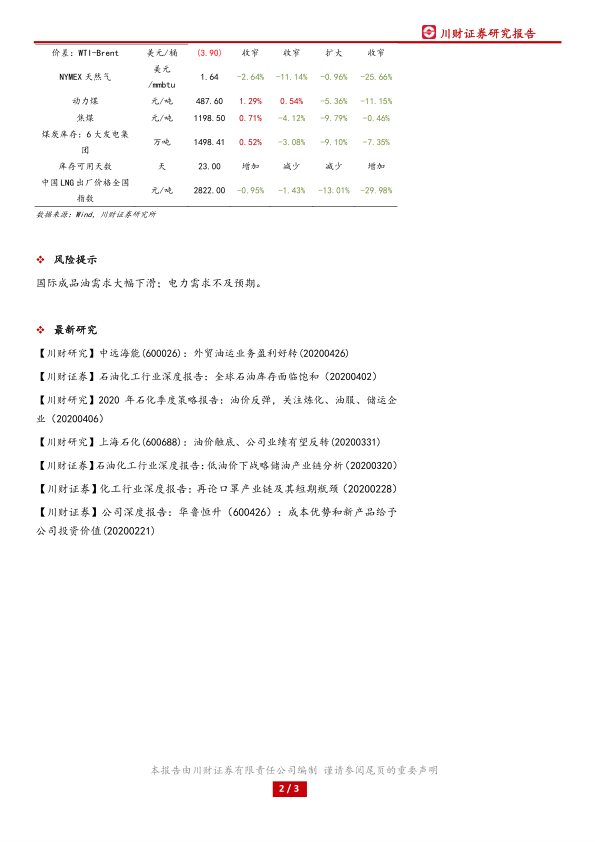 本报告指出了国际成品油需求大幅下滑和电力需求不及预期的风险。