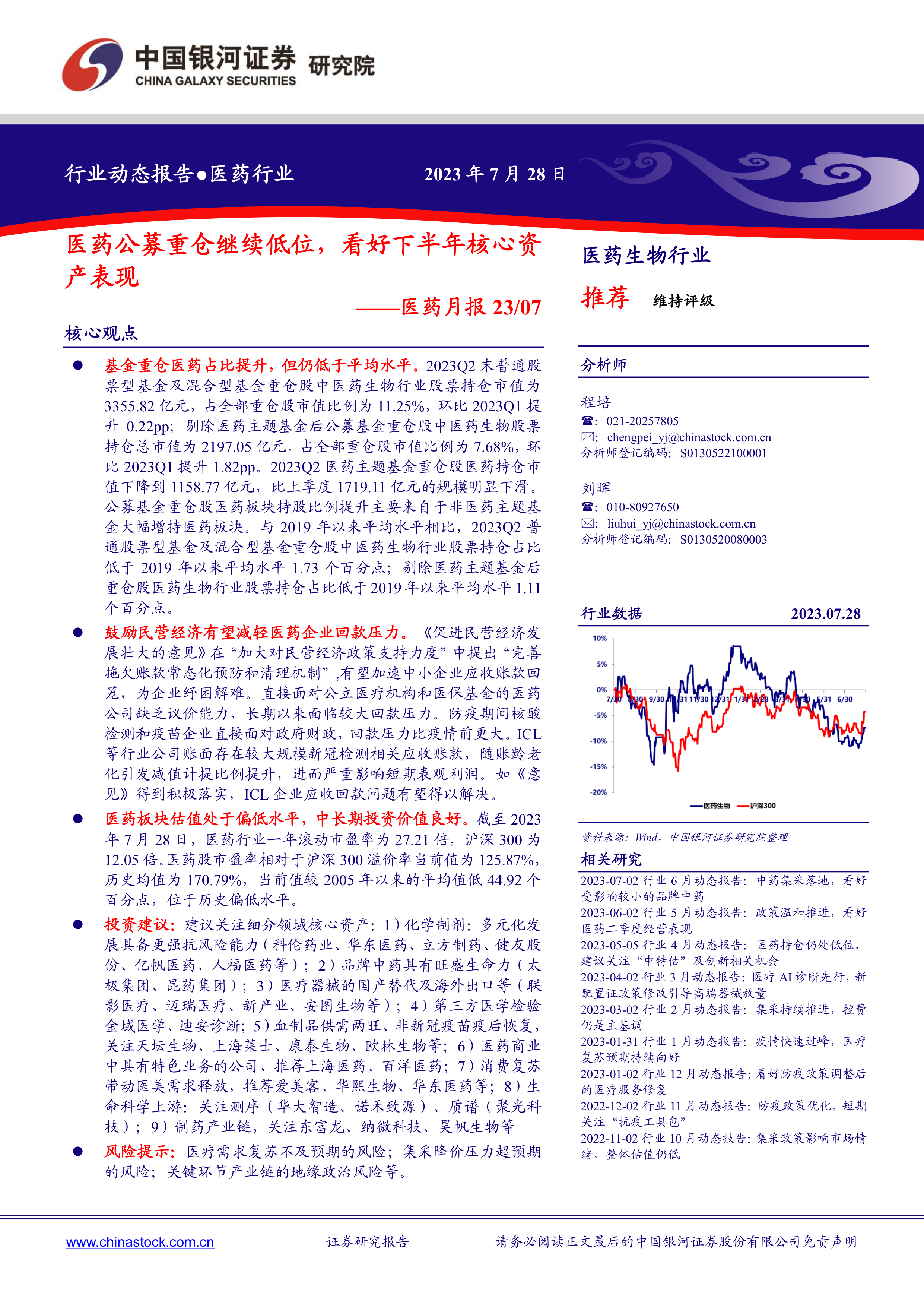 本报告的核心观点是:2023年二季度,尽管公募基金重仓医药占比有所提升,但仍低于2019年以来的平均水平。 医药板块估值处于历史偏低水平,中长期投资价值良好。 鼓励民营经济的政策有望缓解医药企业回款压力,特别是对于受疫情影响较大的企业。 报告建议关注细分领域核心资产,例如化学制剂、品牌中药、医疗器械、第三方医学检验、血制品及疫苗等。