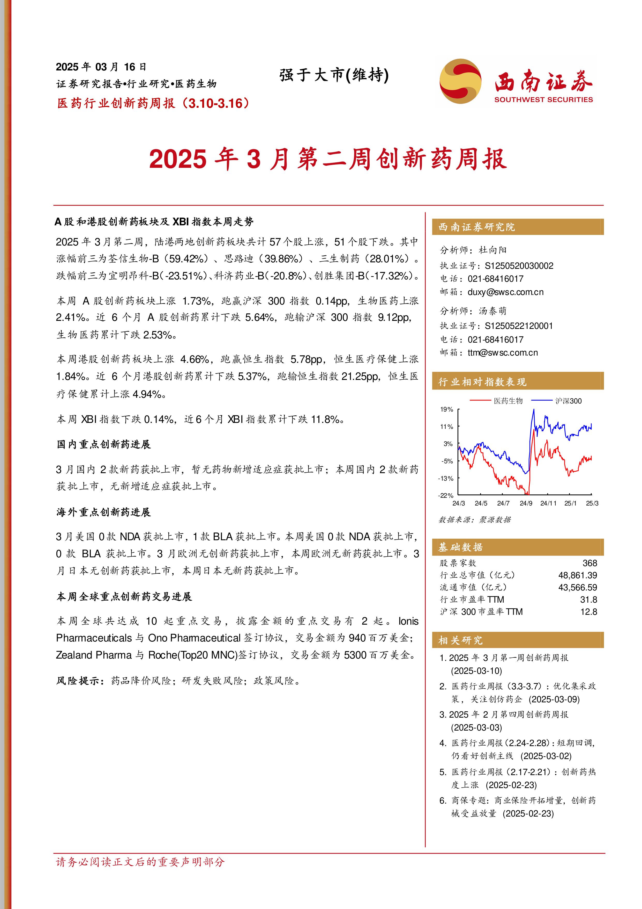 本报告对2025年3月第二周的医药行业创新药市场进行了全面分析,涵盖了市场表现、研发进展和交易情况等多个方面。数据显示,虽然短期内A股和港股创新药板块表现强劲,但长期来看仍面临挑战。国内创新药研发进展喜人,新药获批数量较多,但海外市场新药获批数量相对较少。全球创新药交易活跃,大型交易金额显著。投资者需关注药品降价风险、医改政策风险和研发失败风险。 报告数据主要来源于Wind、医药魔方和公开公司公告,并对数据来源进行了明确标注。 需要注意的是,报告中的信息和观点仅供参考,不构成投资建议。
