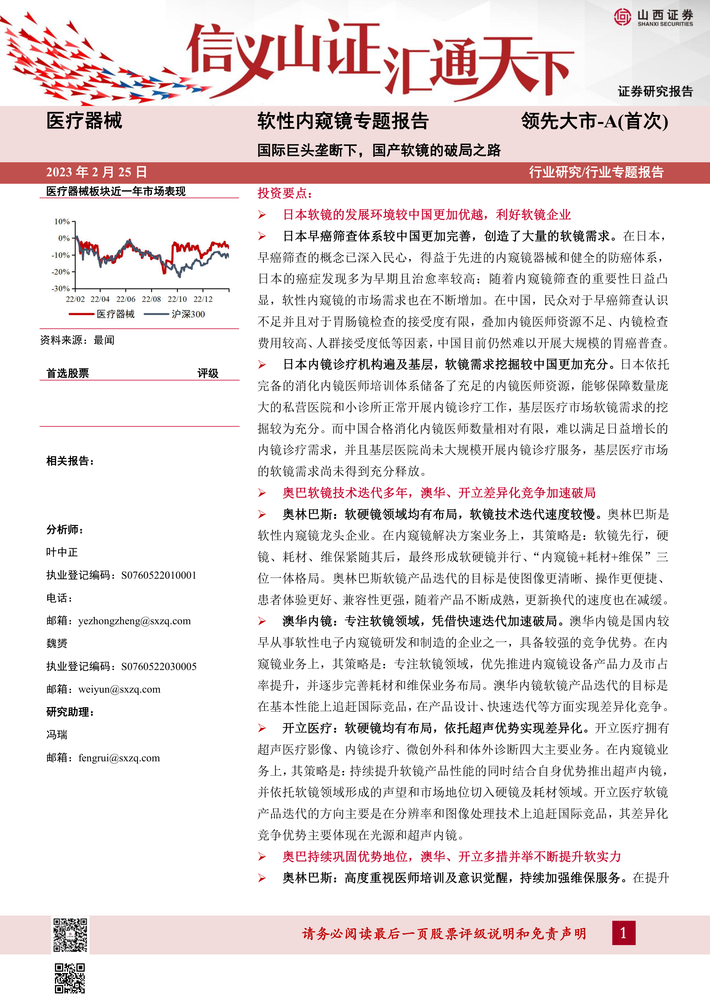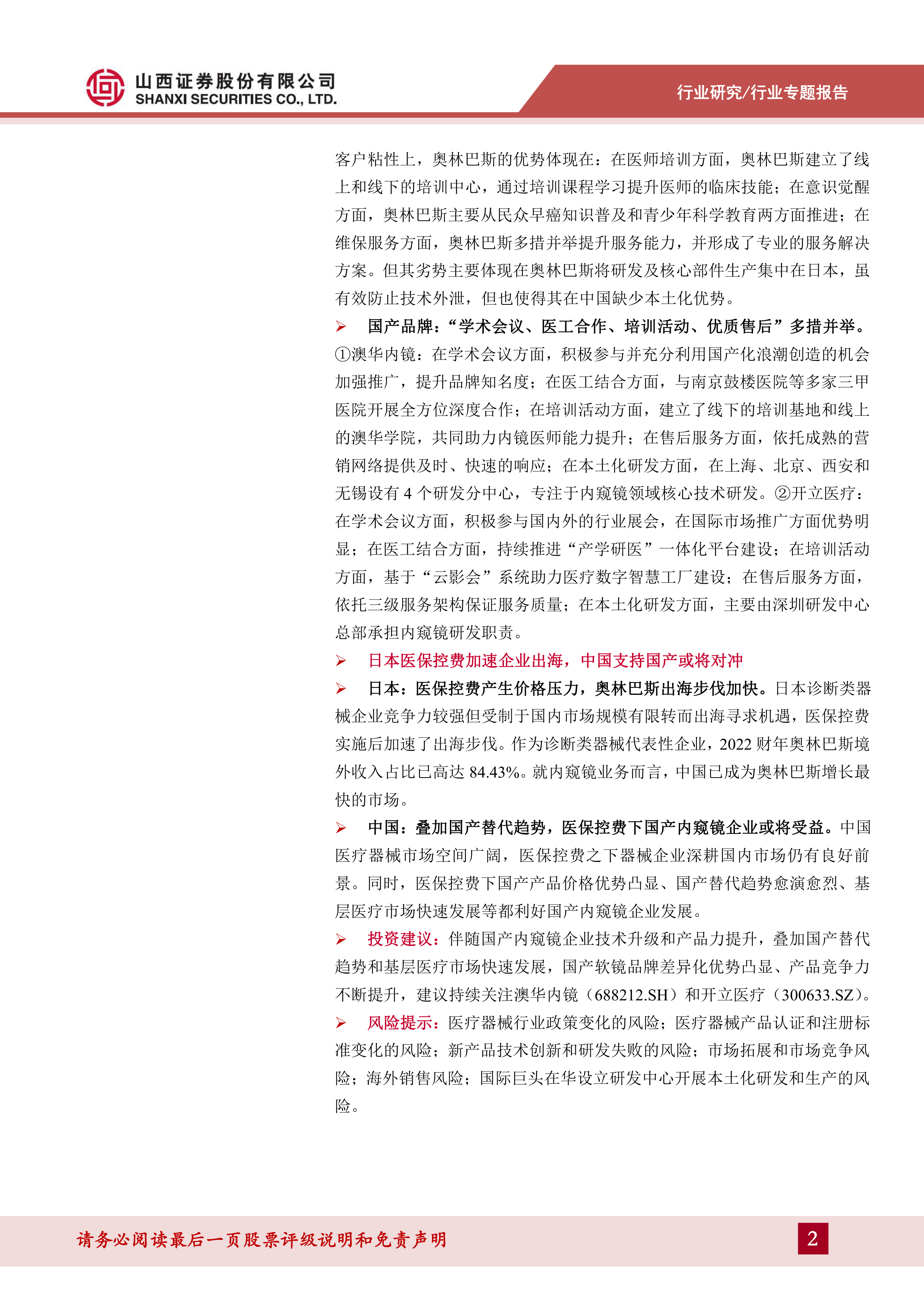 投资建议:伴随国产内窥镜企业技术升级和产品力提升,叠加国产替代趋势和基层医疗市场快速发展,国产软镜品牌差异化优势凸显、产品竞争力不断提升,建议持续关注澳华内镜(688212.SH)和开立医疗(300633.SZ)。