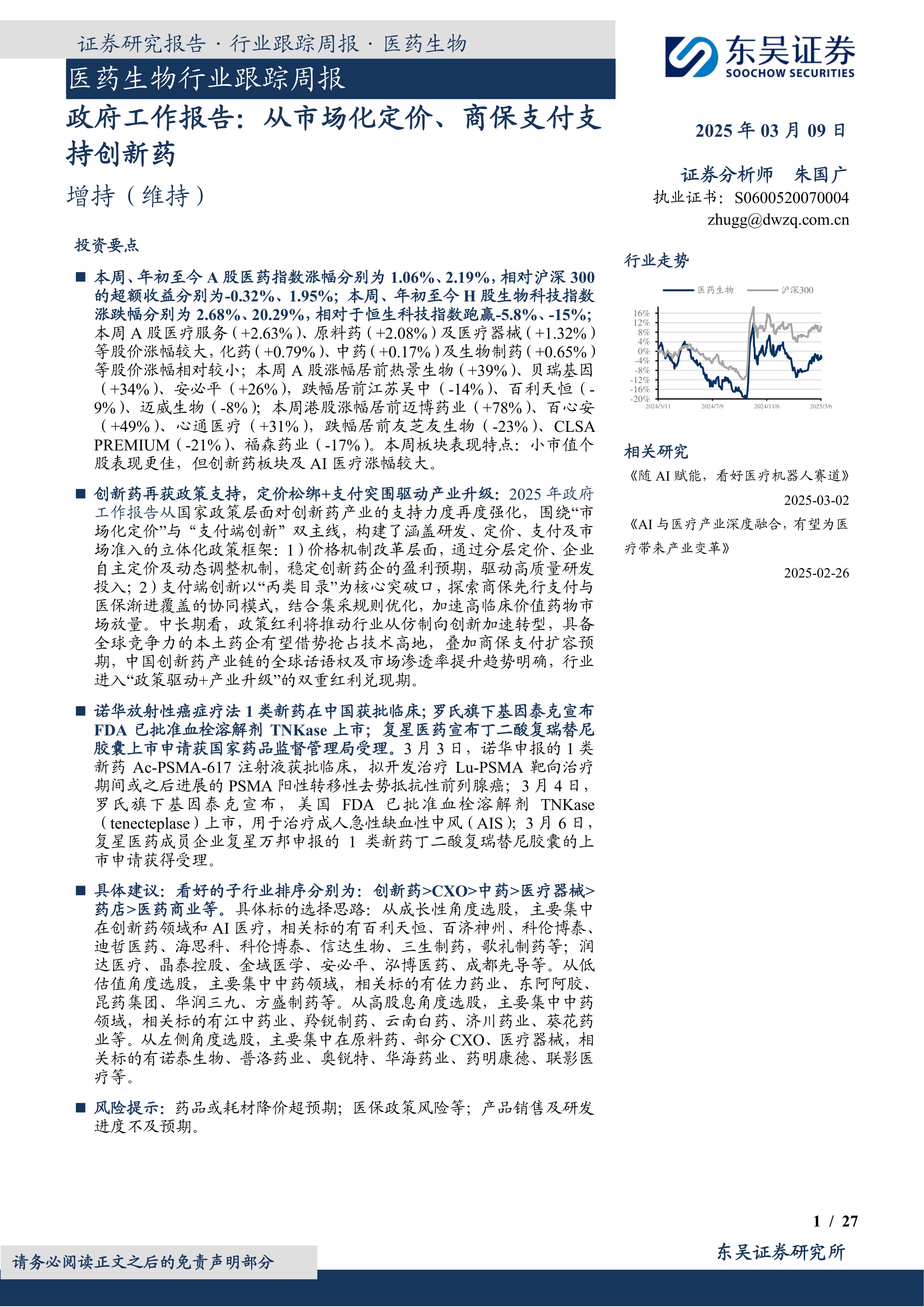 本报告的核心观点是:2025年政府工作报告再次强调支持创新药产业发展,政策利好将推动医药行业从仿制药向创新药加速转型。 具体而言,政策着力于“市场化定价”和“支付端创新”两大方面,构建了涵盖研发、定价、支付及市场准入的立体化政策框架,为创新药企带来双重红利。 报告同时对近期医药行业市场表现、个股涨跌幅、研发进展等进行了数据分析,并提出了具体的投资建议。