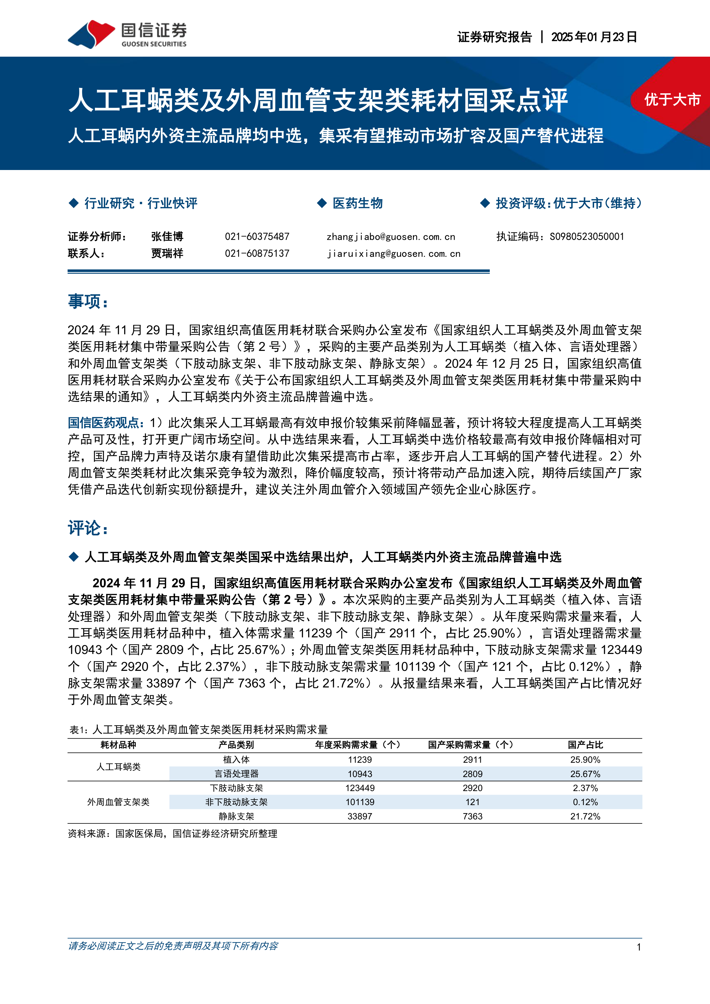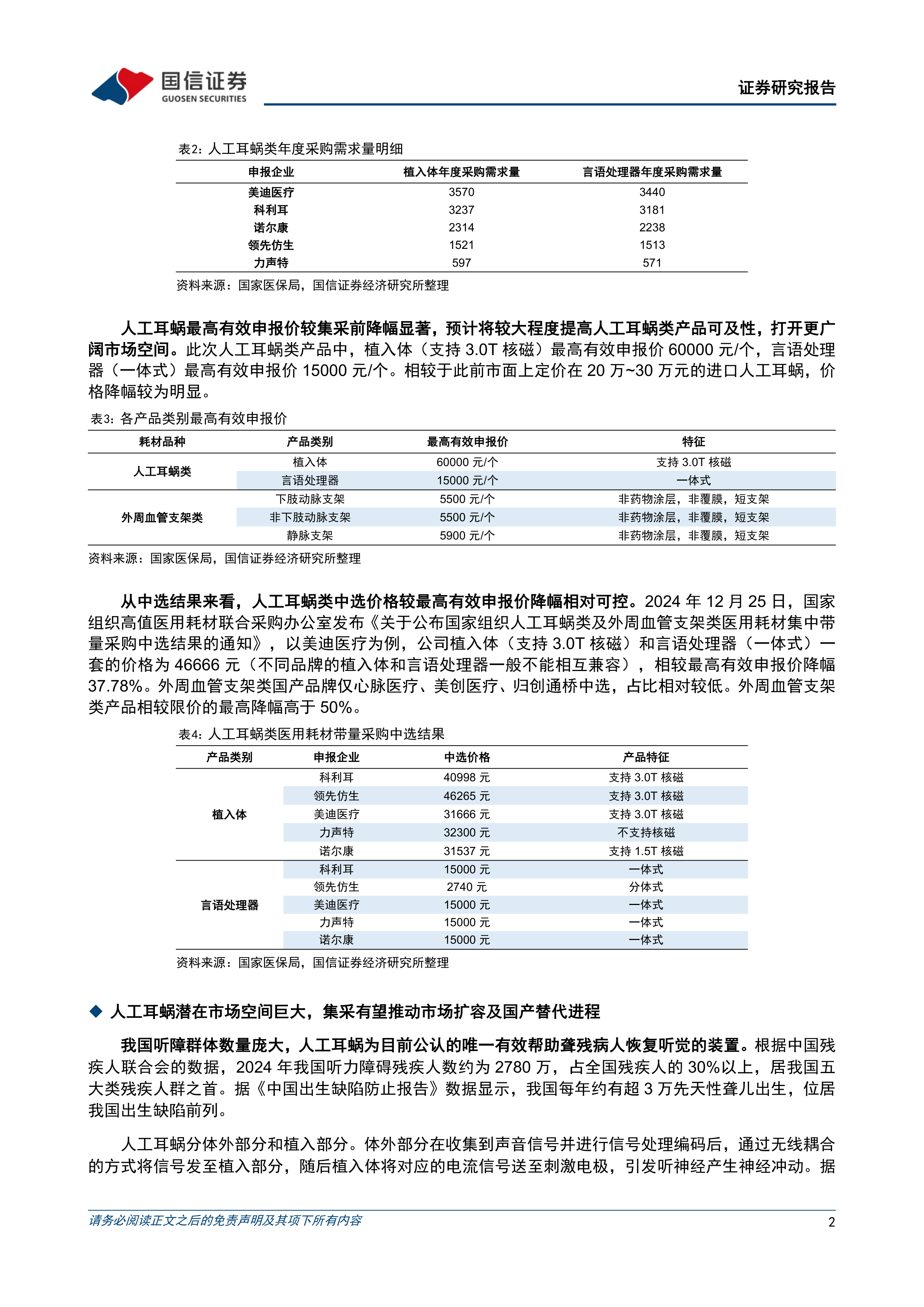 人工耳蜗类及外周血管支架类耗材国采点评:人工耳蜗内外资主流品牌均中选,集采有望推动市场扩容及国产替代进程