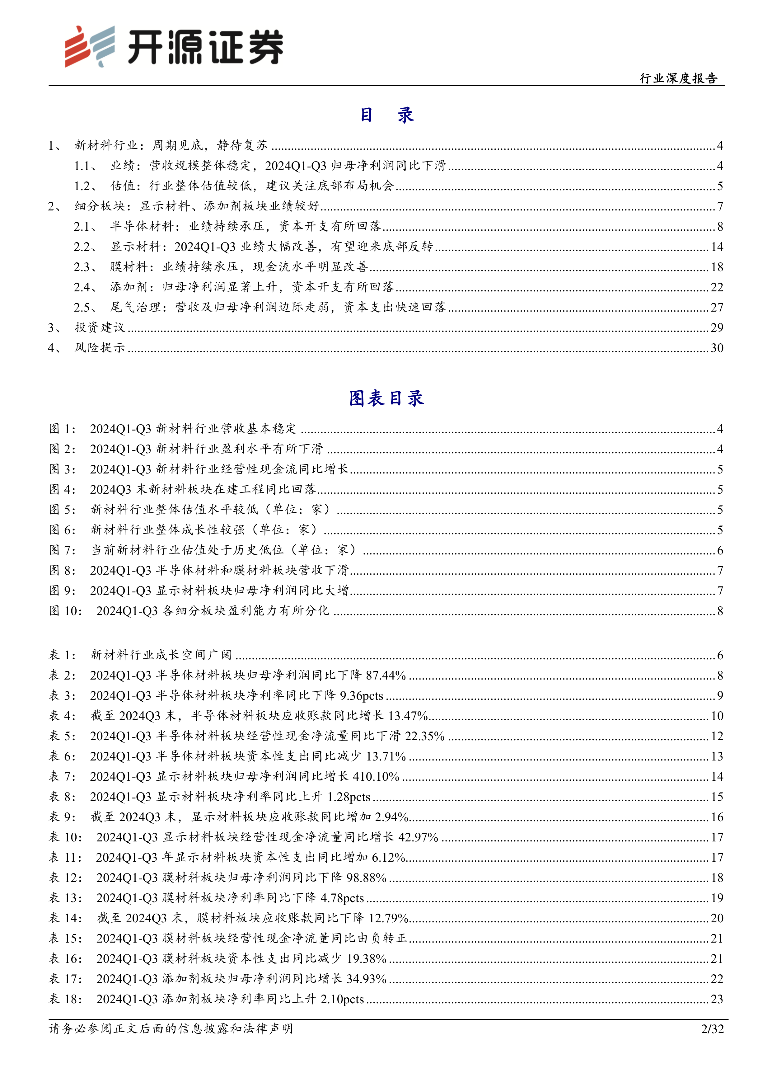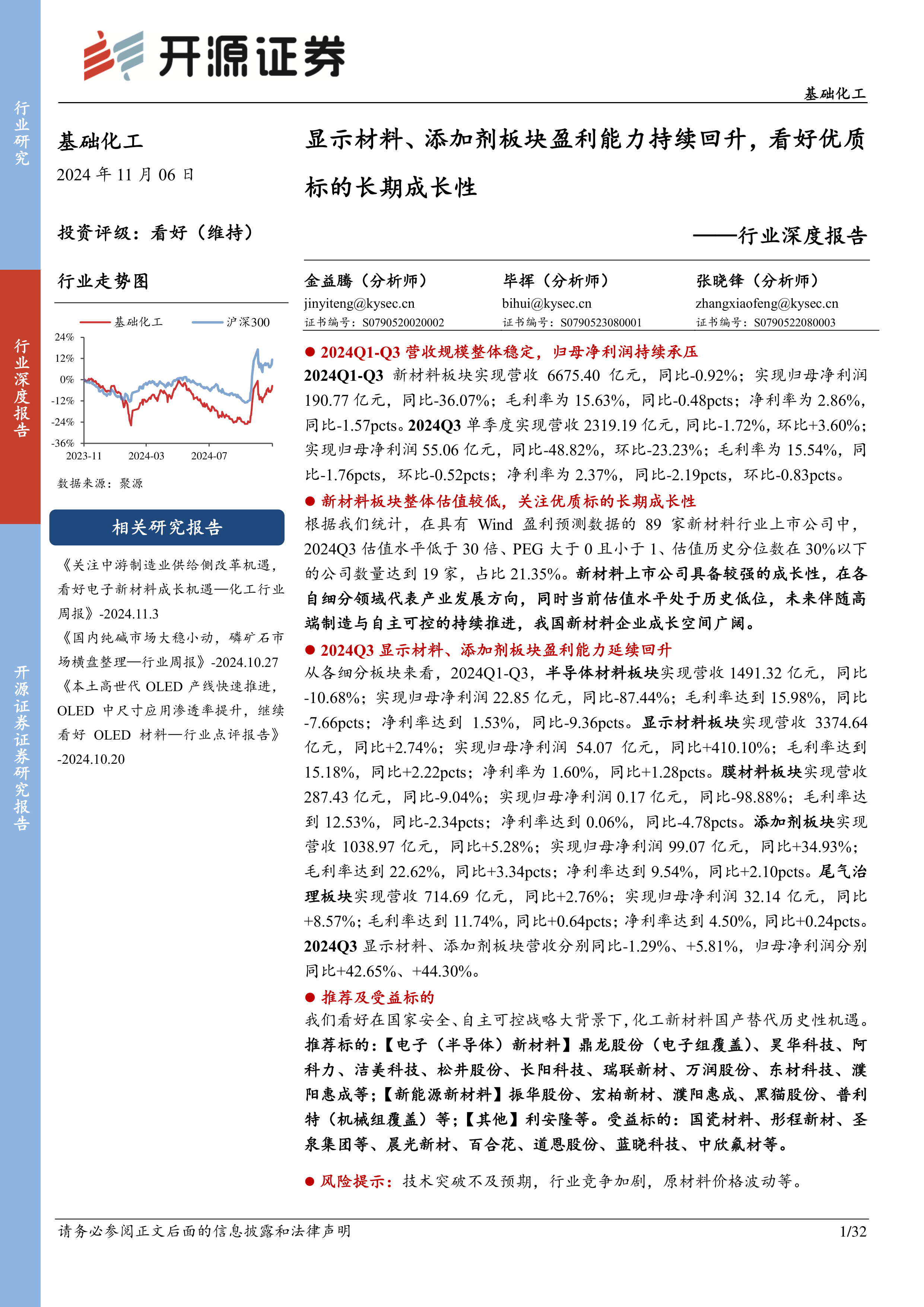 本报告基于开源证券研究所对基础化工新材料行业2024年前三季度数据的分析,指出行业整体处于周期见底阶段,但显示材料和添加剂板块表现突出,盈利能力持续回升。 行业整体估值较低,具备较强成长性,国产替代机遇显著。报告建议投资者关注优质标的的长期成长性,并推荐了多个在国家安全和自主可控战略背景下具有发展潜力的标的,同时提醒投资者注意潜在的风险因素。