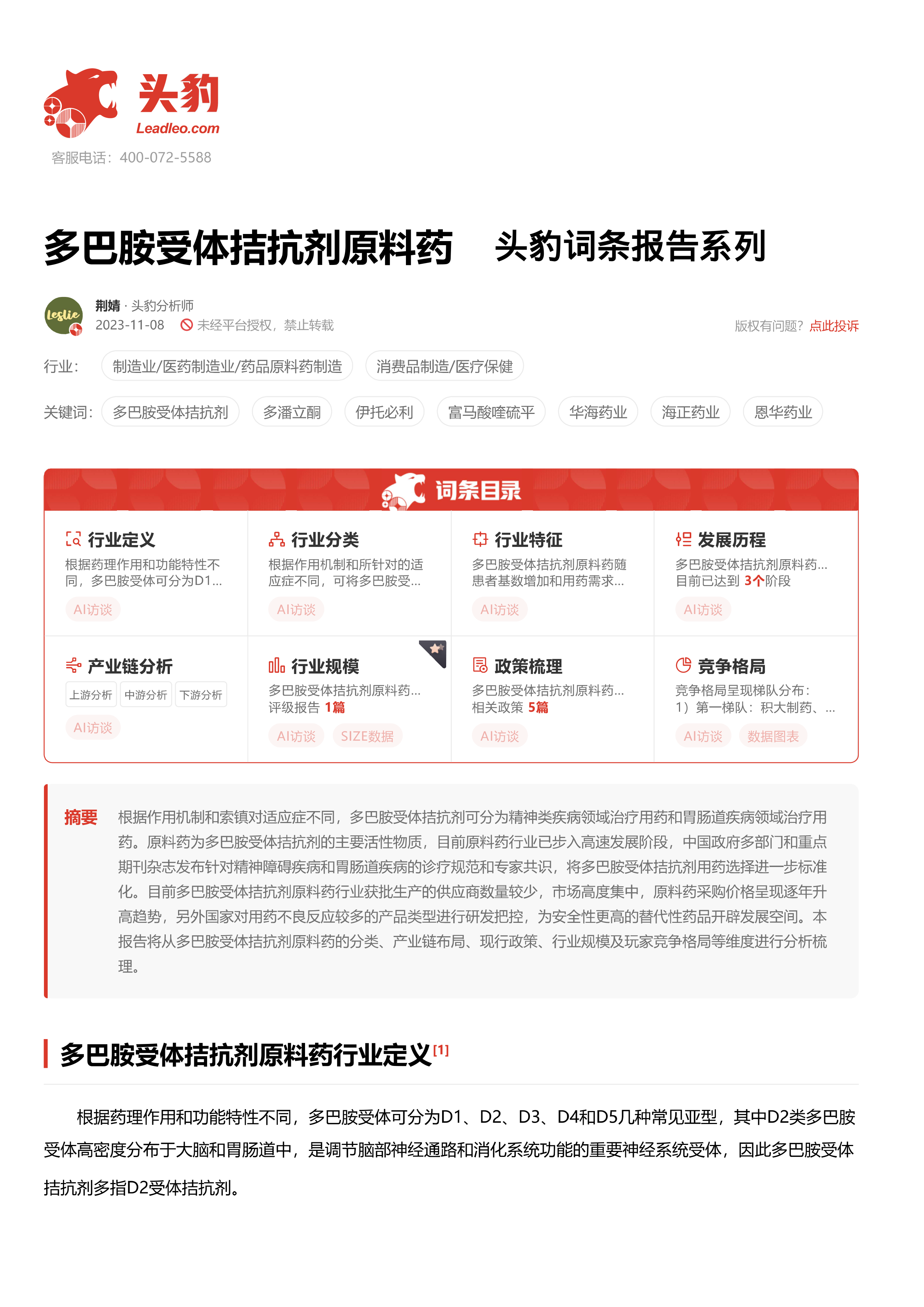 多巴胺受体拮抗剂原料药 头豹词条报告系列