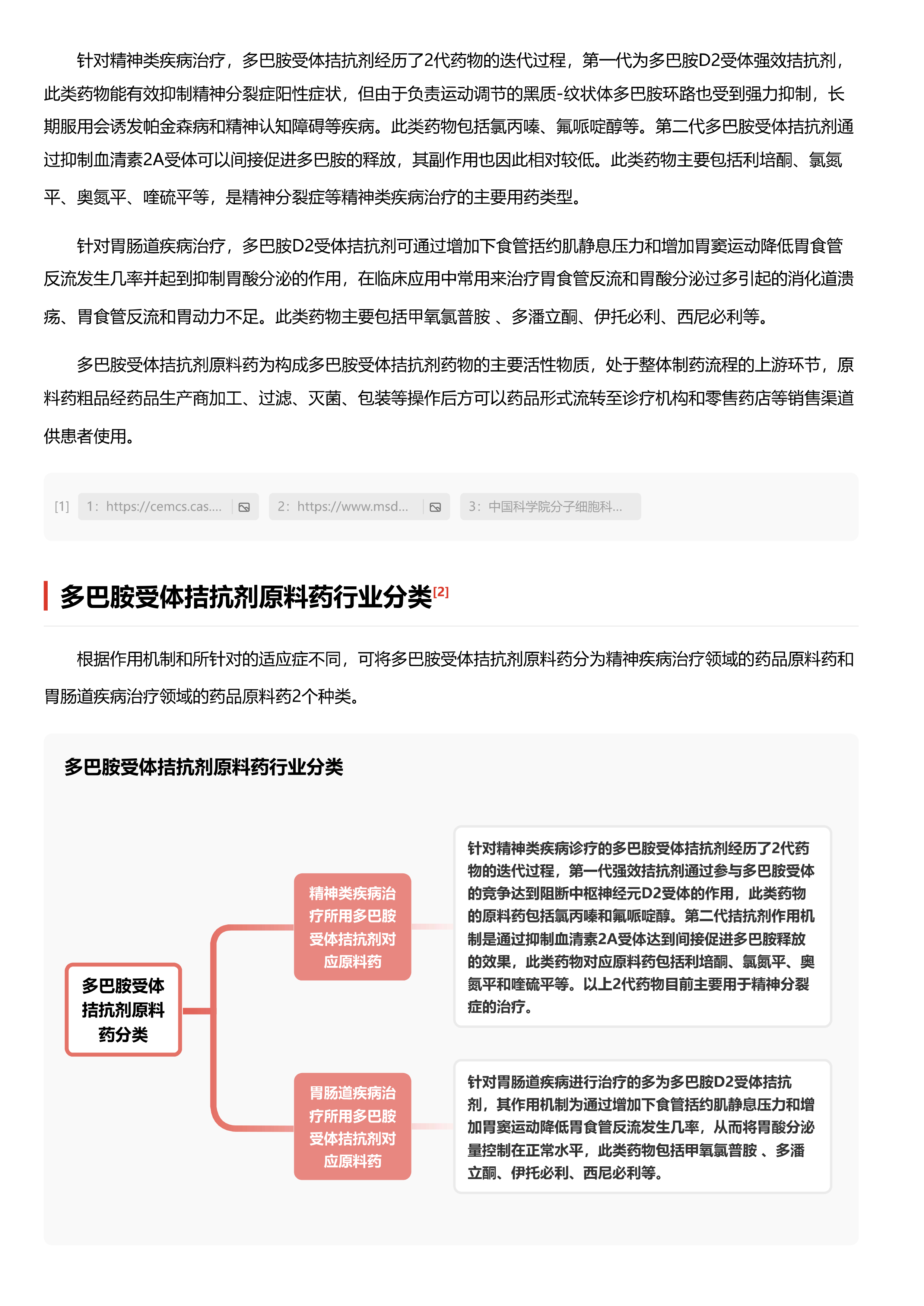 根据作用机制和索镇对适应症不同,多巴胺受体括抗剂可分为精神类疾病领域治疗用药和胃肠道疾病领域治疗用药,原料药为多巴胺受体结抗剂的主要活性物质,目前原料药行业已步入高速发展阶段,中国政府多部门和重点期刊杂志发布针对精神障碍疾病和胃肠道疾病的诊疗规范和专家共识,将多巴胺受体结抗剂用药选择进一步标准化。目前多巴胺受体洁抗剂原料药行业获批生产的供应商数量较少,市场高度集中,原料药采购价格呈现逐年升高趋势,另外国家对用药不良反应较多的产品类型进行研发把控,为安全性更高的替代性药品开辟发展空间。本报告将从多巴胶受体洁抗剂原料药的分类、产业链布局、现行政策、行业规模及玩家竞争格局等维度进行分析梳理