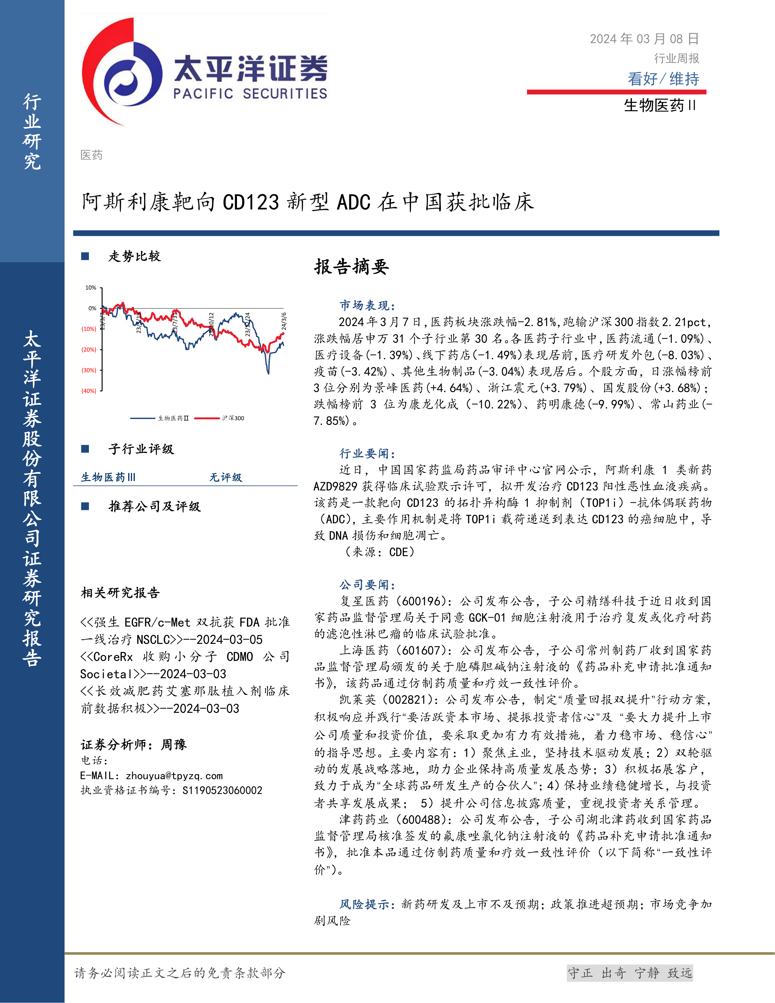 本报告的核心观点是:2024年3月8日,生物医药Ⅱ行业整体表现跑输沪深300指数,但个股表现分化明显。阿斯利康新型ADC药物获批临床试验,以及多家公司发布重要公告,是本周行业内值得关注的事件。未来6个月,行业整体评级为“维持”,部分公司表现值得期待。