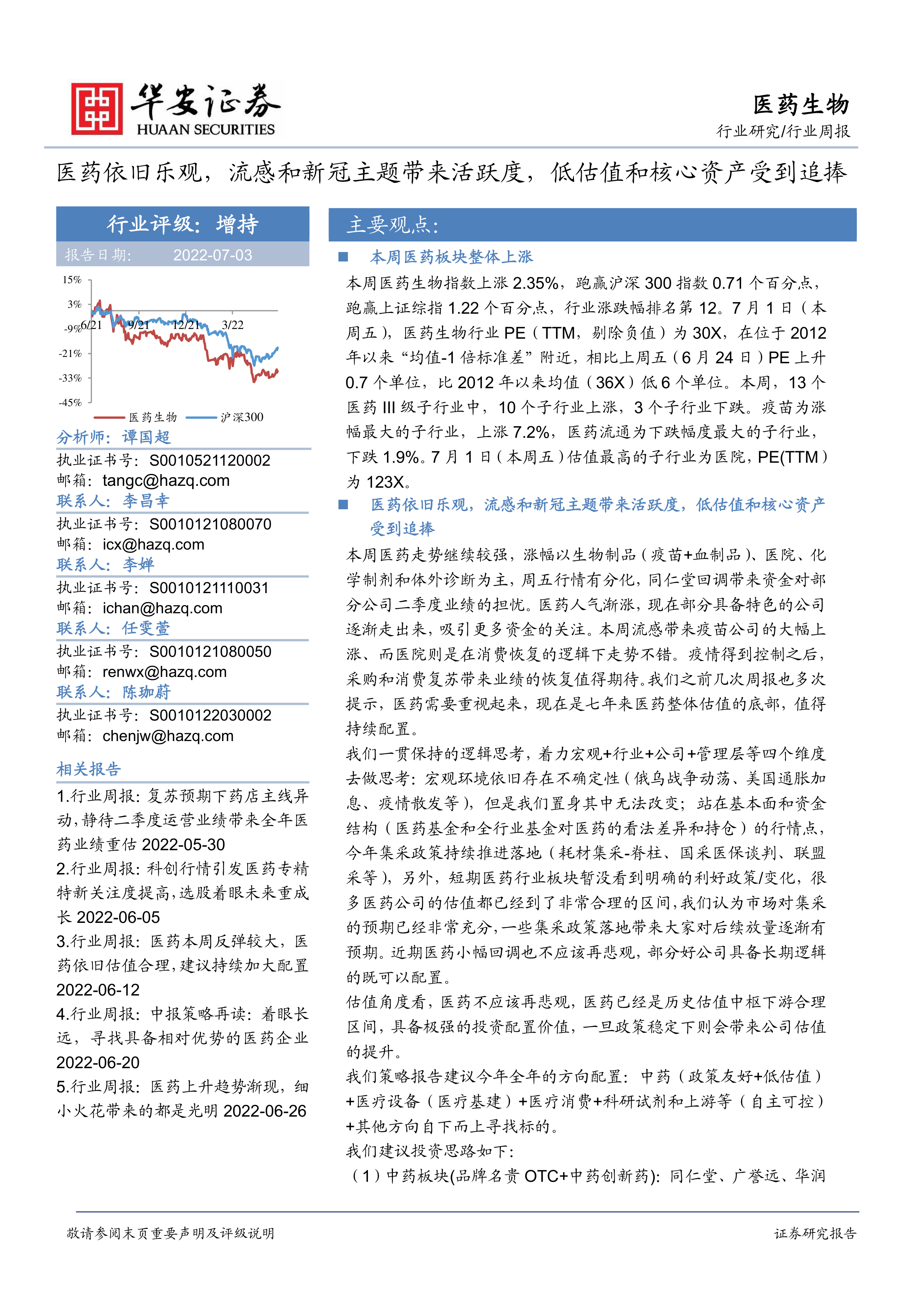 本报告的核心观点是:医药生物行业在2022年7月第一周表现强劲,跑赢大盘,估值处于历史低位,具备较强的投资价值。流感和新冠疫情相关主题提升了市场活跃度,低估值和核心资产受到追捧。报告建议关注中药、医疗设备、医疗消费、科研试剂及上游等多个细分领域,并推荐了一系列具有投资价值的个股。