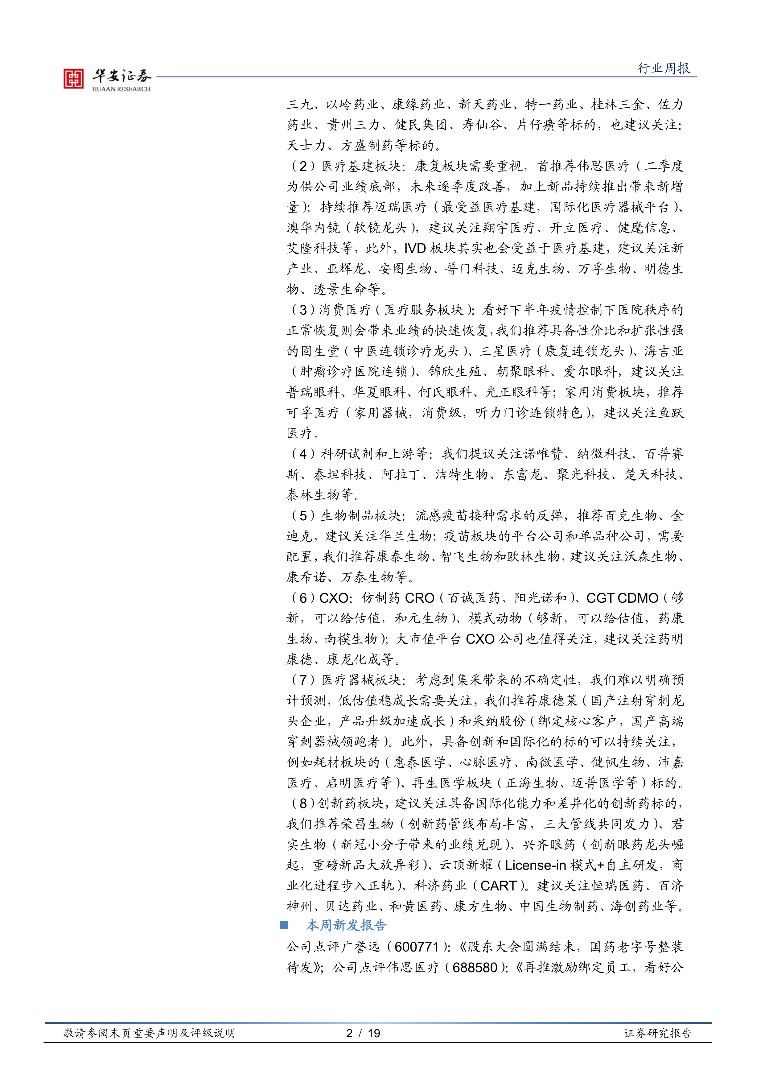 ( 2)医疗基建板块:康复板块需要重视,首推荐伟思医疗(二季度为供公司业绩底部,未来逐季度改善,加上新品持续推出带来新增量);持续推荐迈瑞医疗(最受益医疗基建,国际化医疗器械平台)、澳华内镜(软镜龙头),建议关注翔宇医疗、开立医疗、健麾信息、艾隆科技等,此外, IVD 板块其实也会受益于医疗基建, 建议关注新产业、亚辉龙、安图生物、普门科技、迈克生物、万孚生物、明德生物、透景生命等。