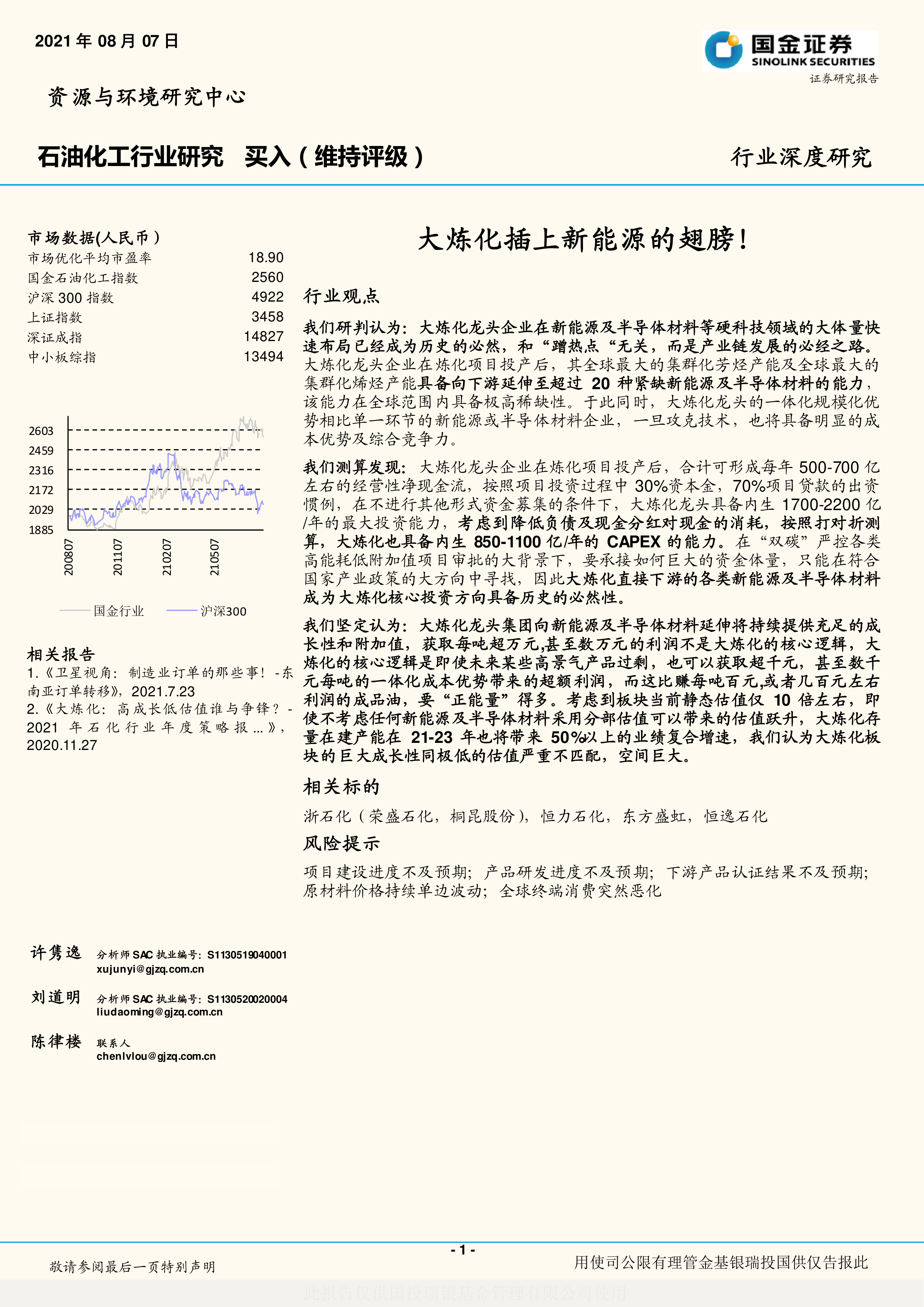我们坚定认为:大炼化龙头集团向新能源及半导体材料延伸将持续提供充足的成长性和附加值,获取每吨超万元,甚至数万元的利润不是大炼化的核心逻辑,大炼化的核心逻辑是即使未来某些高景气产品过剩,也可以获取超千元,甚至数千元每吨的一体化成本优势带来的超额利润,而这比赚每吨百元,或者几百元左右利润的成品油,要“正能量”得多。考虑到板块当前静态估值仅 10 倍左右,即使不考虑任何新能源及半导体材料采用分部估值可以带来的估值跃升,大炼化存量在建产能在 21-23 年也将带来 50%以上的业绩复合增速,我们认为大炼化板块的巨大成长性同极低的估值严重不匹配,空间巨大。