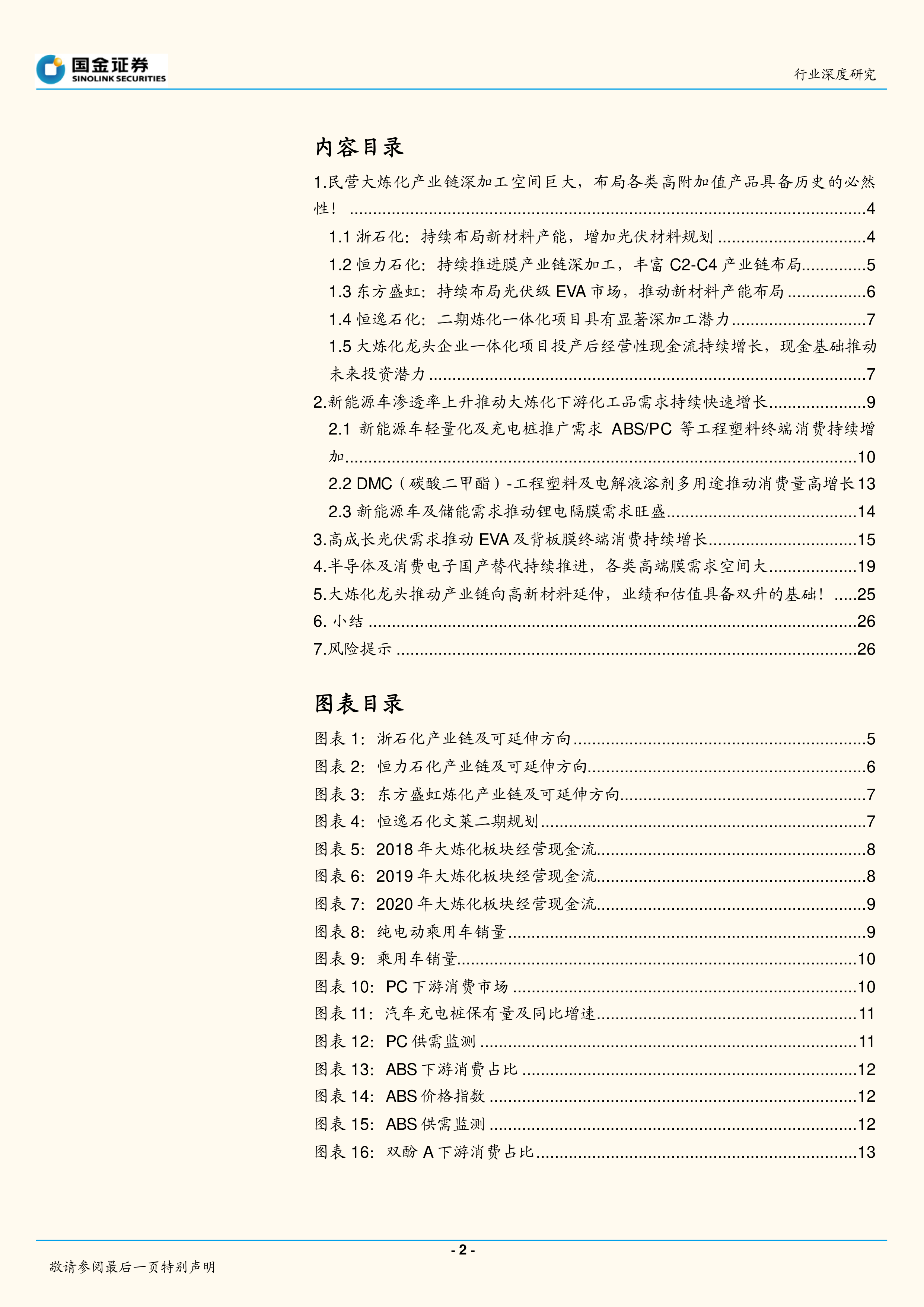 本报告从民营大炼化产业链深加工空间、新能源车需求增长对大炼化下游产品的影响、光伏需求增长对EVA及背板膜的影响、半导体及消费电子国产替代对高端膜需求的影响以及大炼化龙头企业业绩和估值提升等方面进行了深入分析。