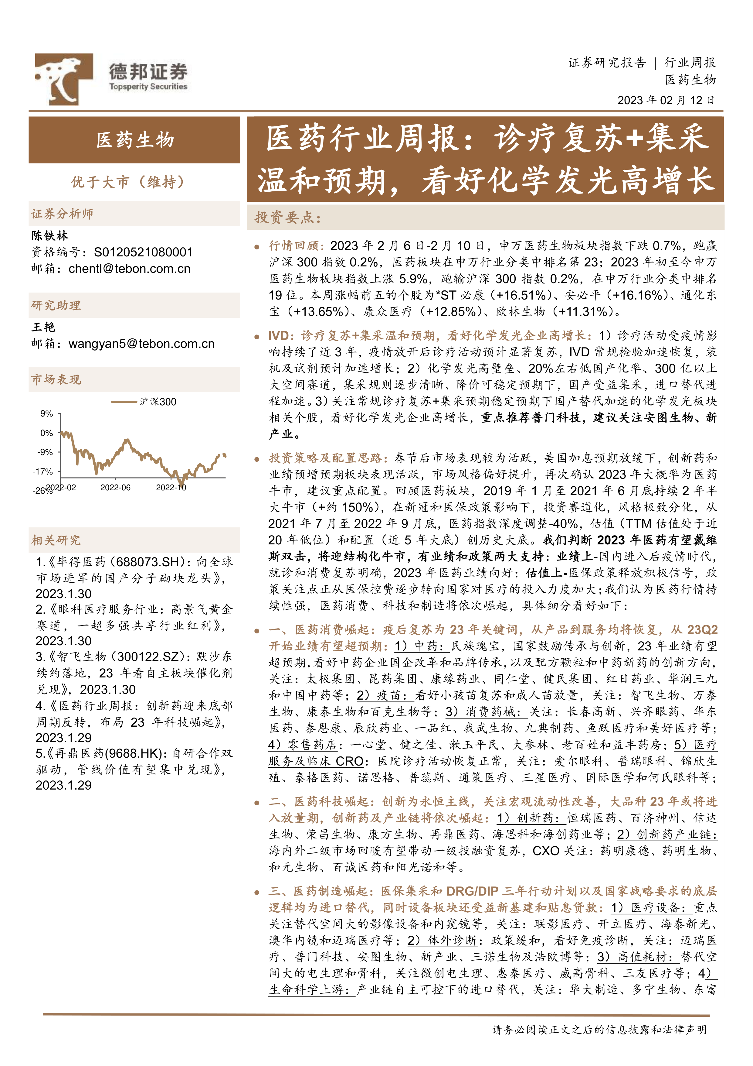 本小节详细阐述了报告对医药行业整体的乐观预期,并从业绩和政策两个方面进行了论证。业绩方面,报告指出后疫情时代国内就诊和消费复苏明确,2023年医药业绩向好;政策方面,报告认为医保政策释放积极信号,政策关注点正从医保控费逐步转向国家对医疗的投入力度加大。