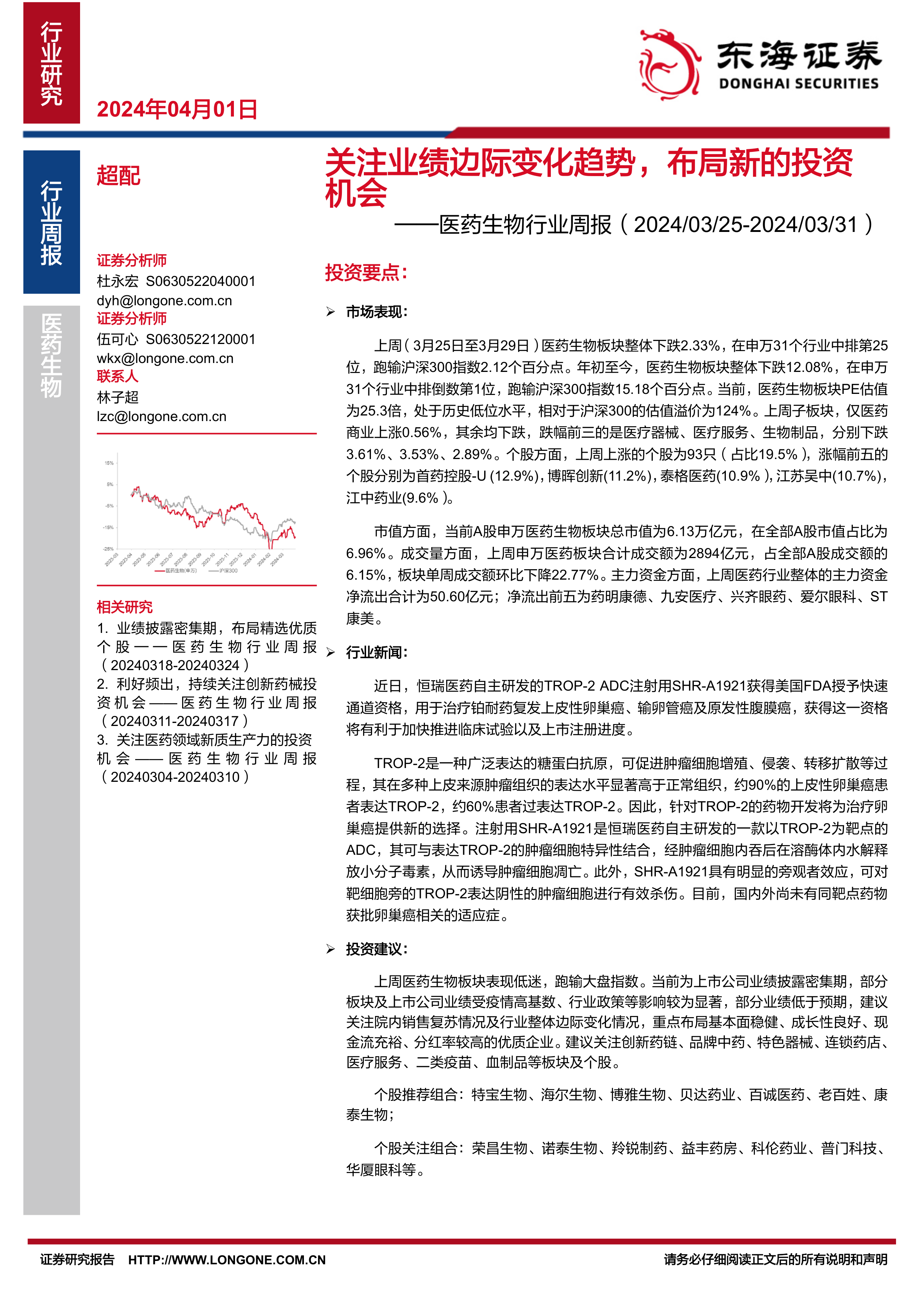 本报告对2024年3月25日至3月31日期间医药生物板块的市场表现、重点公司、行业新闻以及投资建议进行了全面分析。报告指出,尽管上周医药生物板块表现低迷,但估值处于历史低位,为长期投资者提供了潜在的投资机会。 报告建议投资者关注业绩披露期内公司业绩表现,并重点关注创新药链、品牌中药、特色器械、连锁药店、医疗服务、二类疫苗、血制品等板块的优质企业。 同时,报告也提醒投资者注意行业面临的政策、业绩和事件风险。 投资者应根据自身风险承受能力和投资目标,谨慎决策。