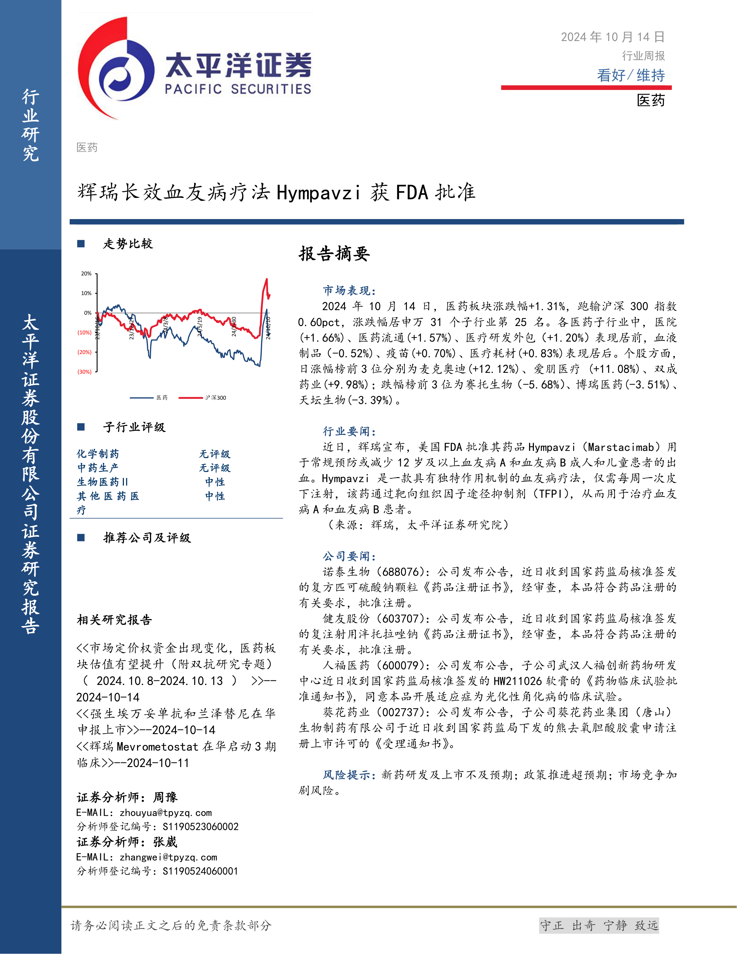 医药行业周报:辉瑞长效血友病疗法Hympavzi获FDA批准