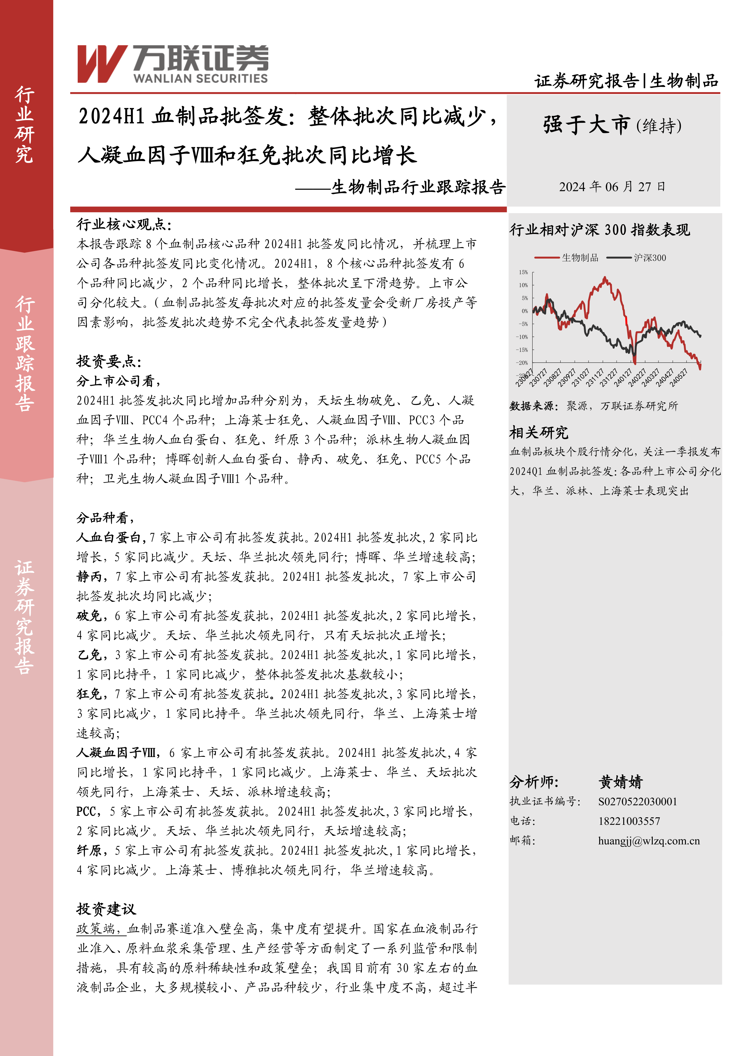 狂免,7家上市公司有批签发获批。2024H1批签发批次,3家同比增长,3家同比减少,1家同比持平。华兰批次领先同行,华兰、上海莱士增速较高;