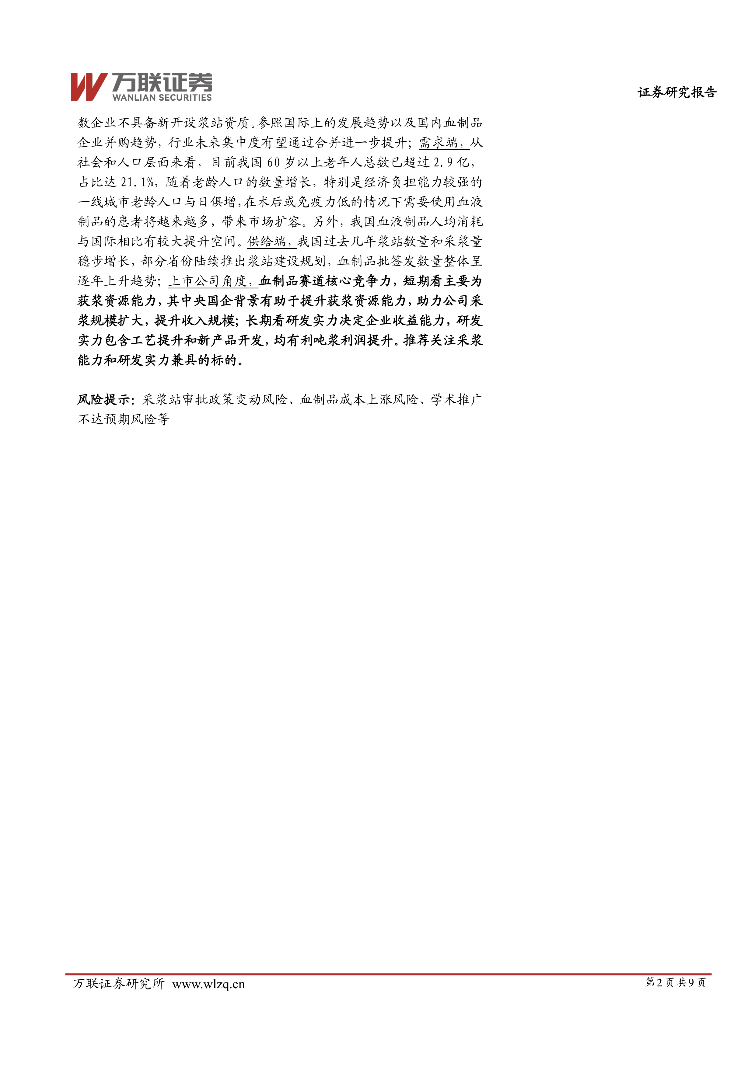 报告最后给出了投资建议和风险提示。投资建议部分指出,血制品行业准入门槛高,行业集中度有望提升;老龄化加剧和人均消耗量提升空间巨大,为行业长期增长提供了动力。建议关注具备强大采浆能力和研发实力的企业。风险提示部分则列举了采浆站审批政策变动风险、血制品成本上涨风险以及学术推广不达预期风险等。